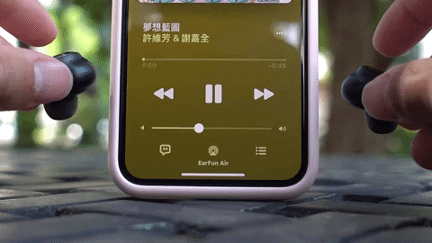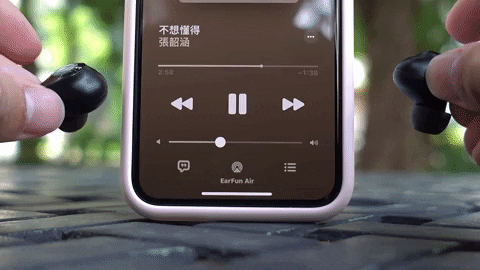 因為內建了「入、離耳偵測」的功能,因此當你把單邊耳機拿下來時,音樂就會自動暫停;再戴回去,音樂又會繼續播放。最特別的是,不像 AirPods Pro 或 TRACK Air+ 可以很輕易找到感應器的位置,EarFun Air 耳機上根本沒有感應器的蹤跡,我找了半天才發現原來 EarFun 把感應器放在耳機後側的內部,需要把那個區域覆蓋住才會觸發反應,如此一來便可以避免傳統光感應器只要距離物體太近就有所反應的誤觸問題,相當聰明的設計。