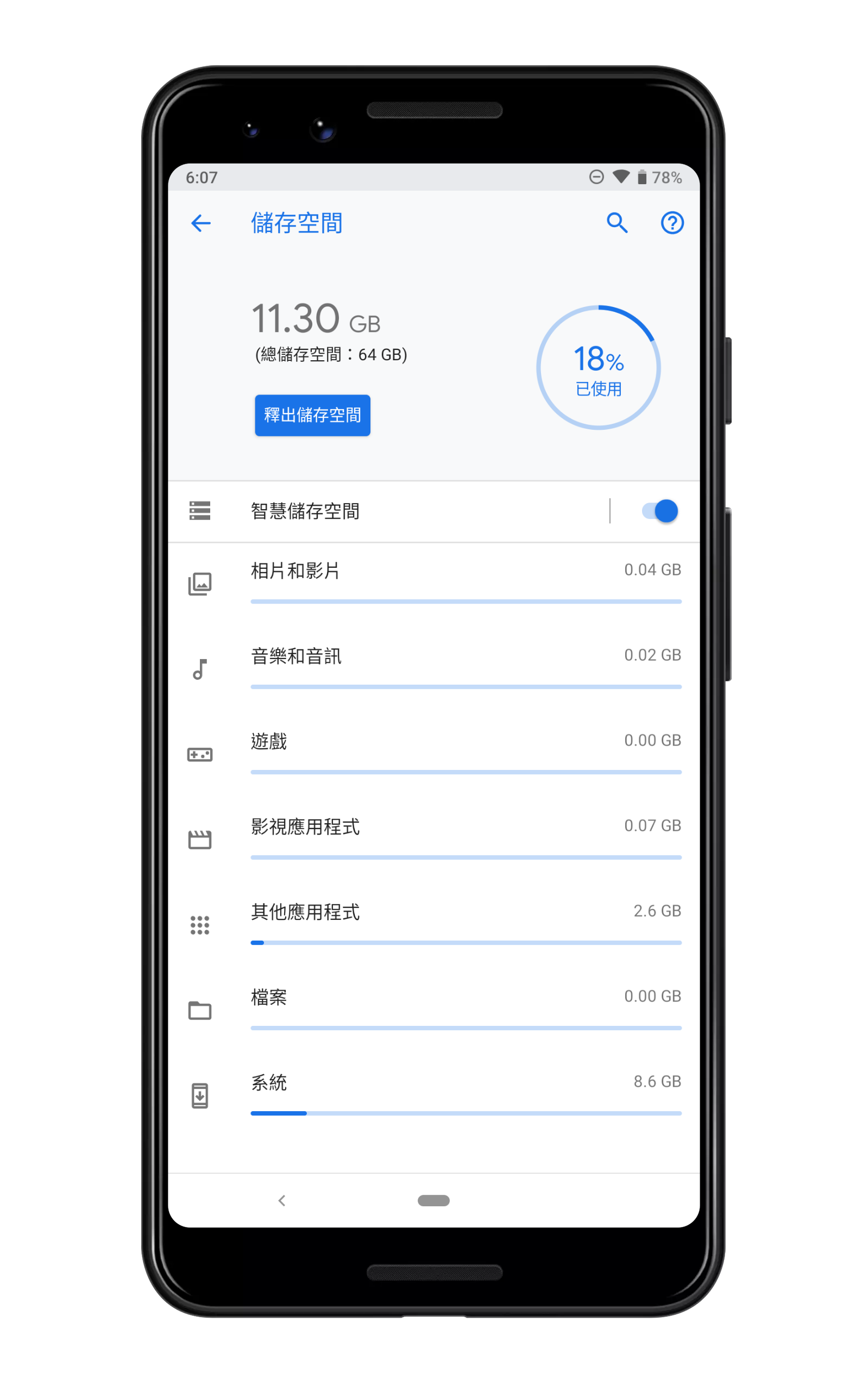 ▲ 64GB 版本的 Pixel 3 首次開機大約還剩 52.7GB 可用。