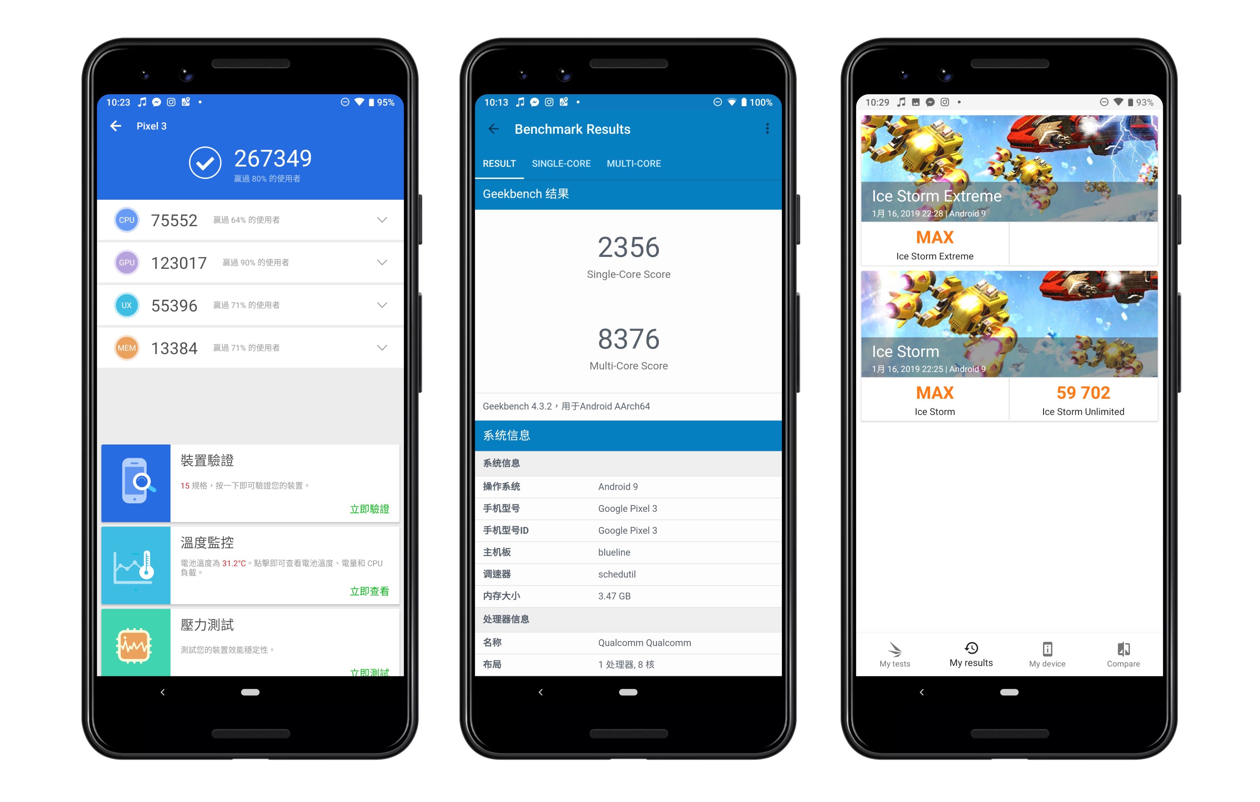 ▲ Pixel 3 透過 Antutu Benchmark、GeekBench 4 與 3DMark 跑分的分數。