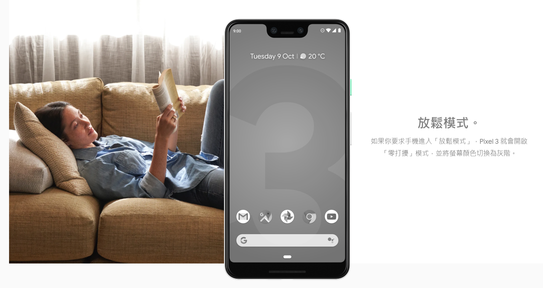 ▲ 開啟 Pixel 3 上的「放鬆模式」後會自動打開「零打擾」模式,並且將螢幕切換至灰階。(翻攝自 / Google Pixel 3 系列介紹頁面)
