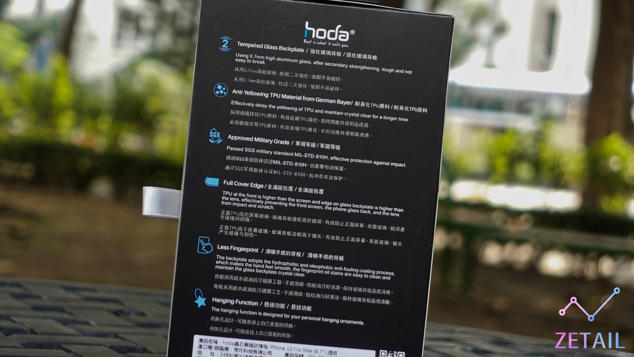 ▲ 背面有關於 hoda 晶石玻璃防摔保護殼更詳細的特色介紹。
