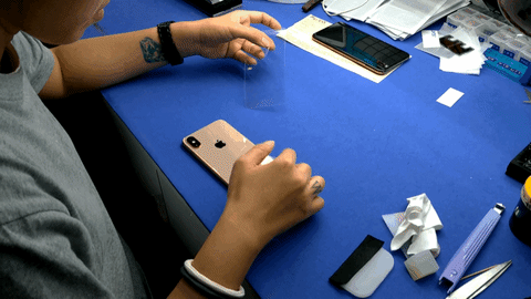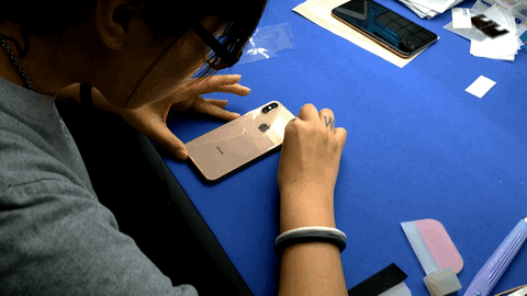 ▲ 玻璃清理乾淨後就可以將背貼貼上了!從 GIF 圖可以看到膜斯密碼的師傅真的很厲害,貼膜精準又快速,我自己貼都要對準很久XD。