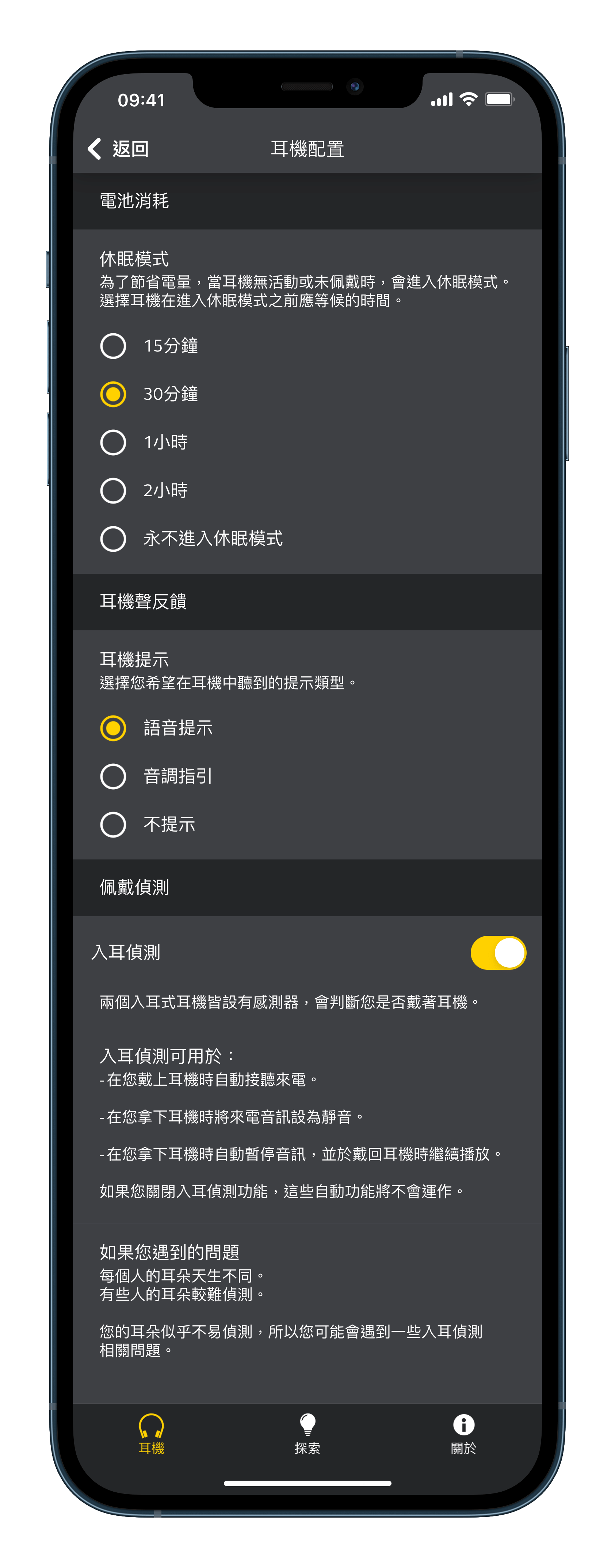 ▲ 在設定中可以找到「入耳偵測」功能的開關。另外,還能設定耳機要多久後自動關機、耳機的提示要使用語音還是音效。