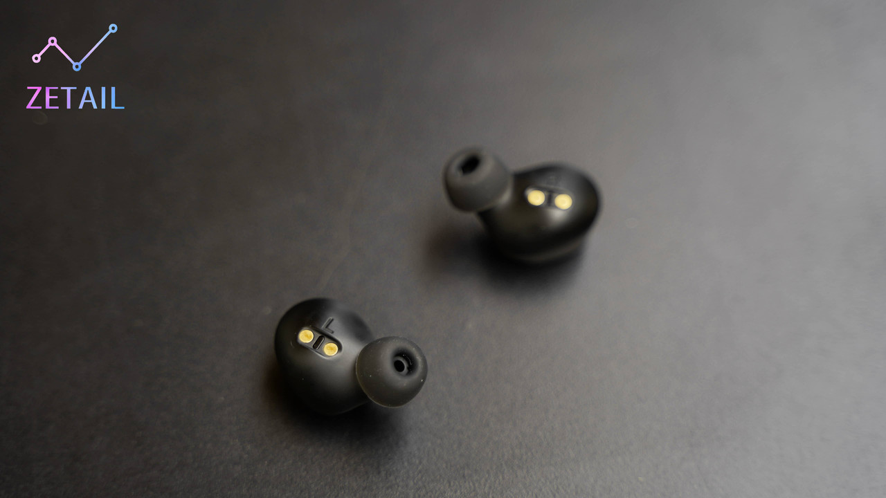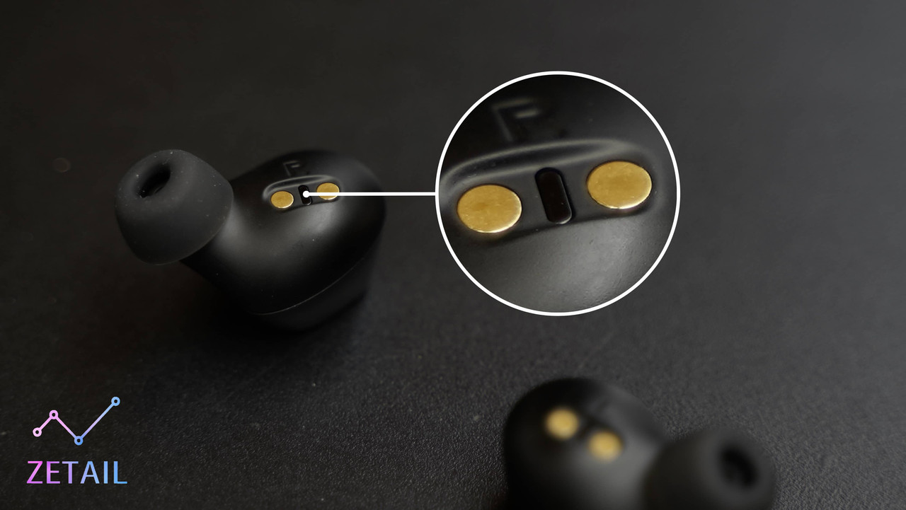 ▲ 用於偵測耳機配戴狀態的感應器位於兩個金屬觸點之間,相當隱秘。