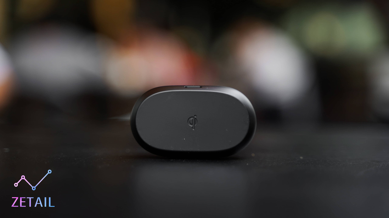 ▲ Elite 7 Pro 充電盒支援 Qi 無線充電,底部有 Qi 的 Logo,標示著無線充電線圈的位置。