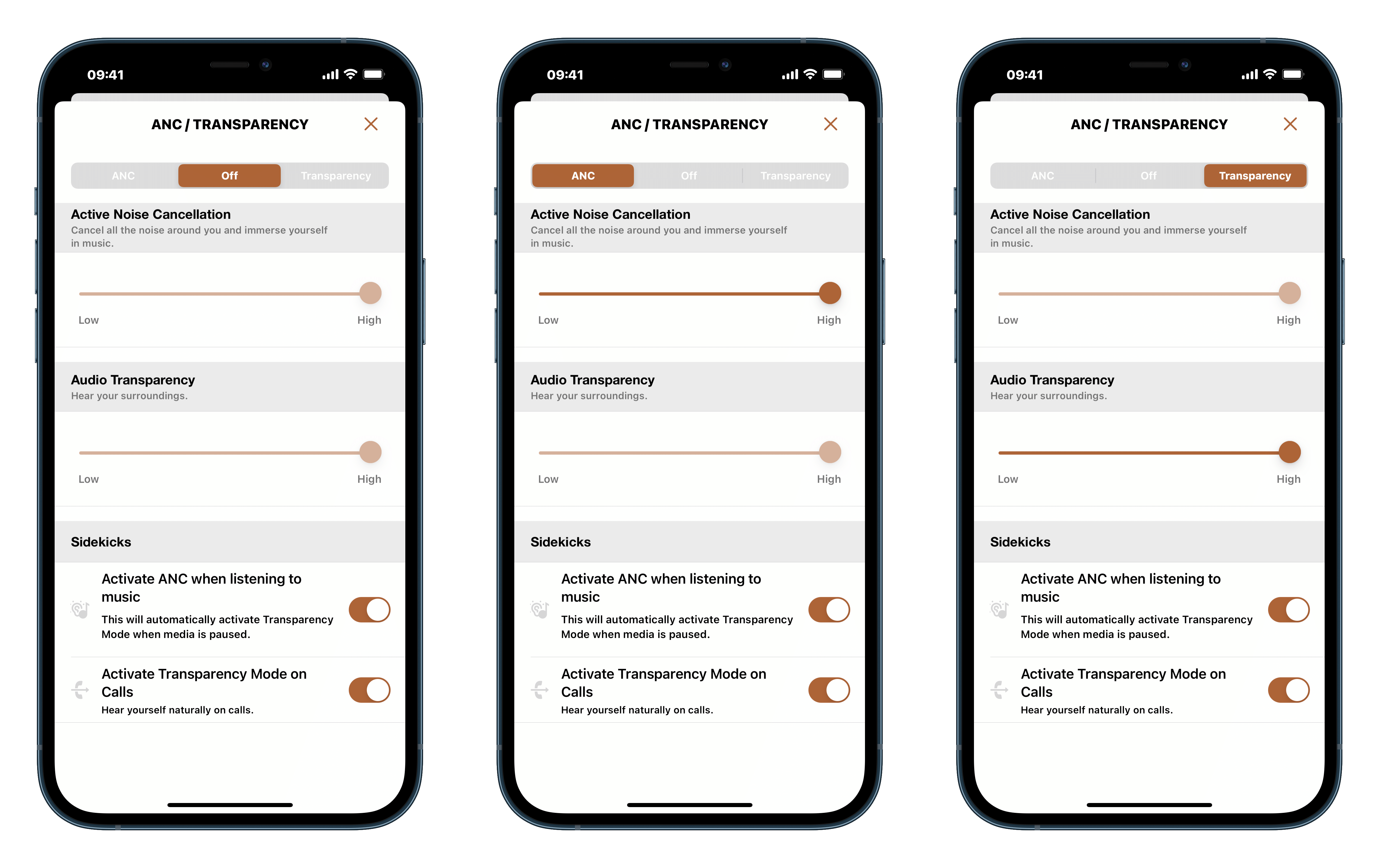 ▲ T5 II ANC 的降噪模式分為「主動降噪」、「關閉」跟「透明模式」三種,你可以自由調整主動降噪和透明模式的強度。