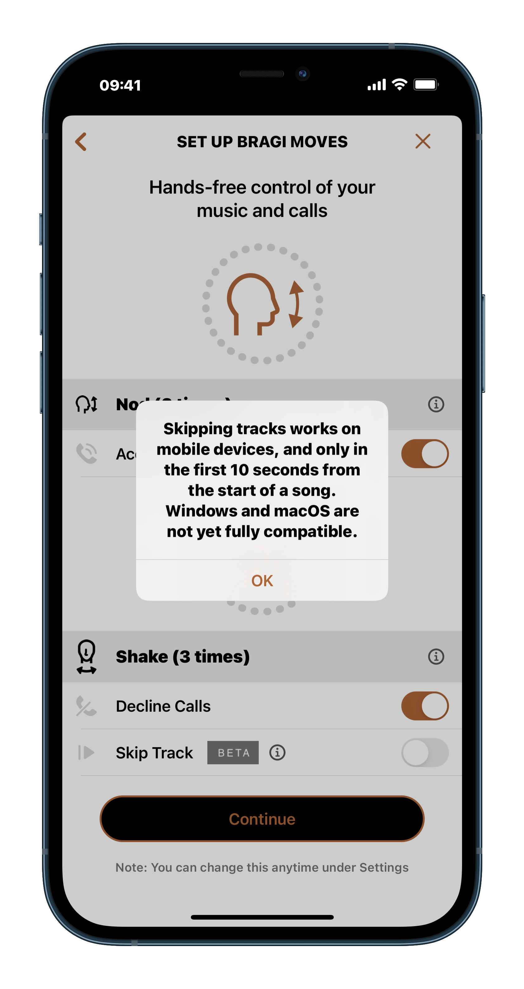 ▲ 在開始使用 Bragi Moves 前,可以先進行校準,確保它能更精準的辨識你的頭部動作。
