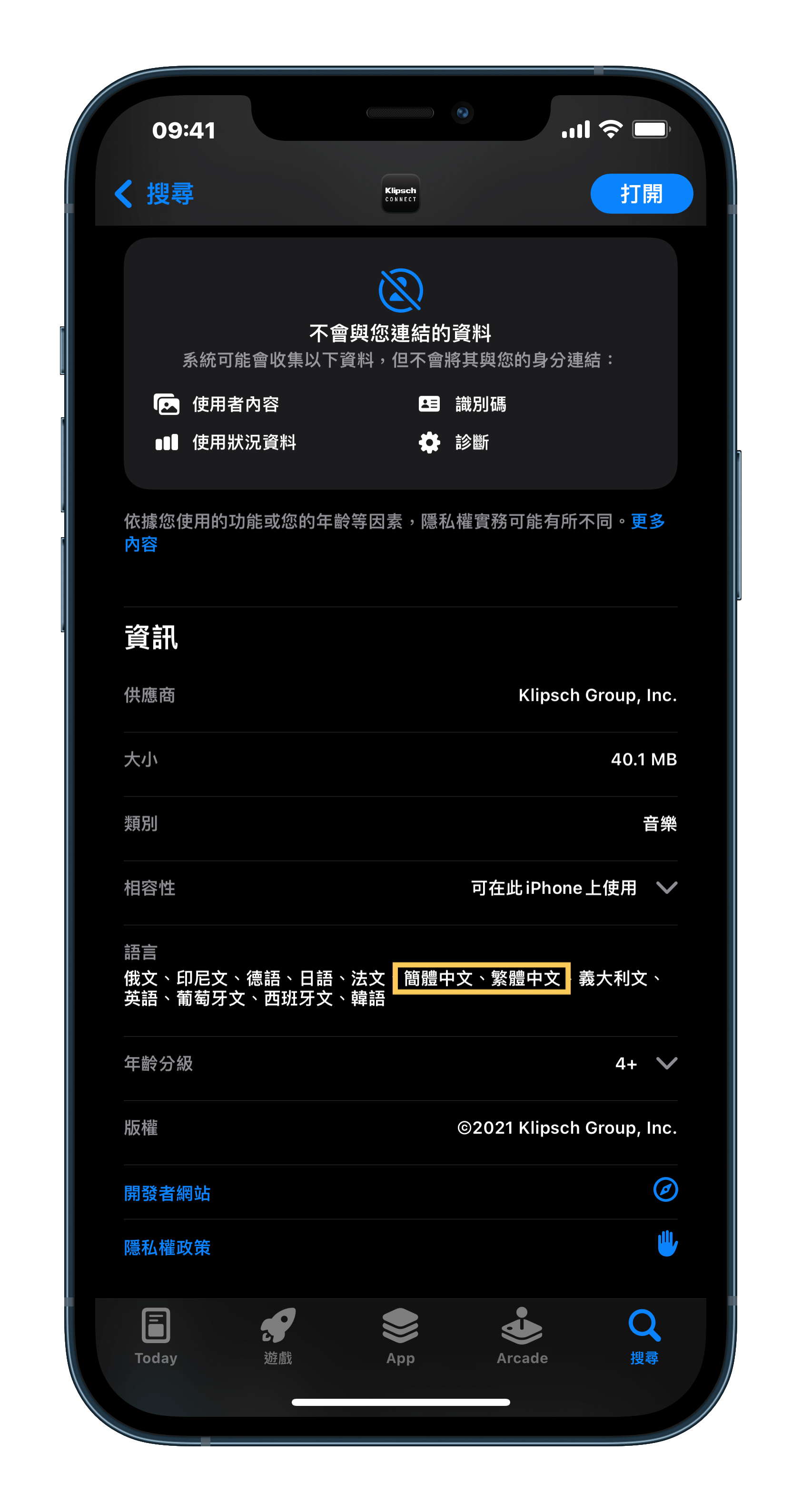 ▲ Klipsch Connect 在 App Store 裡面的語言欄顯示支援繁體和簡體中文。