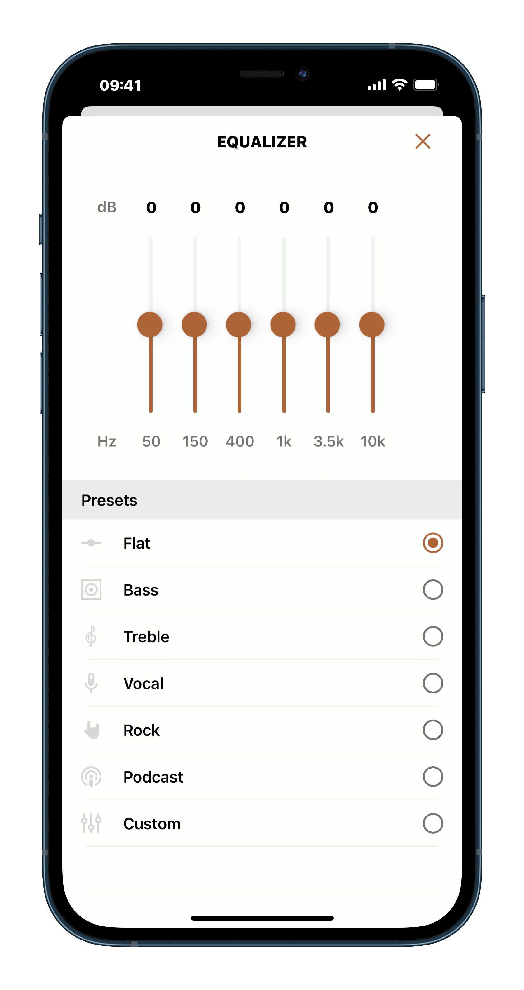 ▲ 點進「等化器」頁面,下方有 6 種預設的 EQ,分別是「平坦」、「低頻」、「高頻」、「人聲」、「搖滾」、「播客」(Podcast)。如果預設的 EQ 都不合你的胃口,也可以自己手動調整上方的頻率曲線。