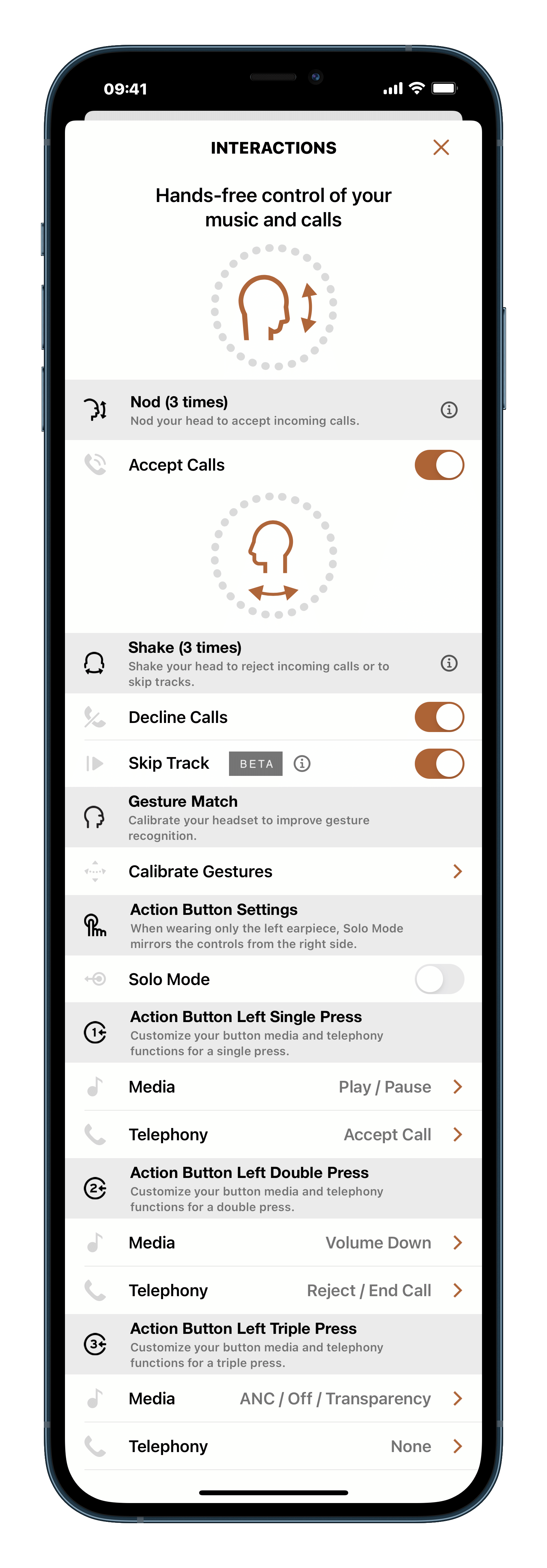 ▲ Bragi Moves 目前支援點頭三下接聽來電、搖頭三下拒接來電、搖頭三下切換至下一首歌,而且都可以獨立開關。