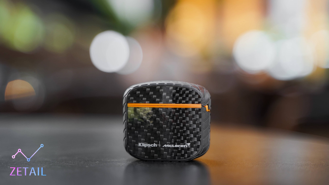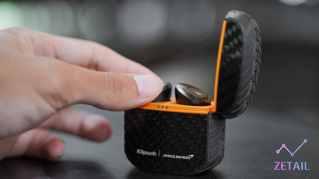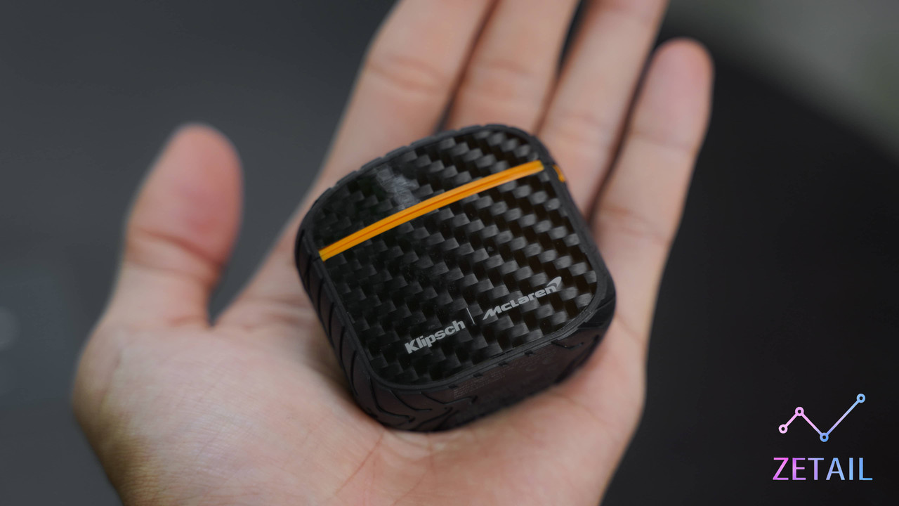 除了碳纖維材質、輪胎紋路,Klipsch 也刻意在 T5 II ANC 充電盒的上、下蓋銜接處以及內部使用 McLaren 標誌性的「木瓜橙」配色進行點綴、裝飾,強化聯名的連結。T5 II ANC 的充電盒體積不大,隨身攜帶放在口袋、包包都很方便。