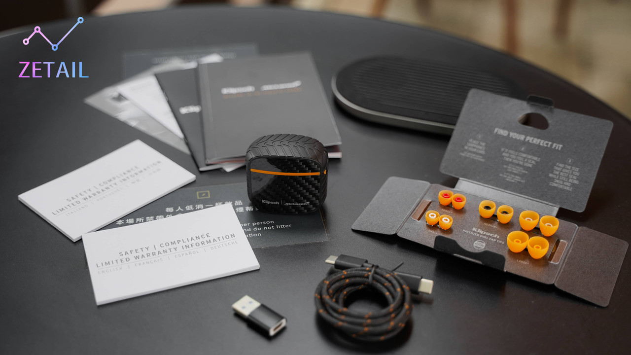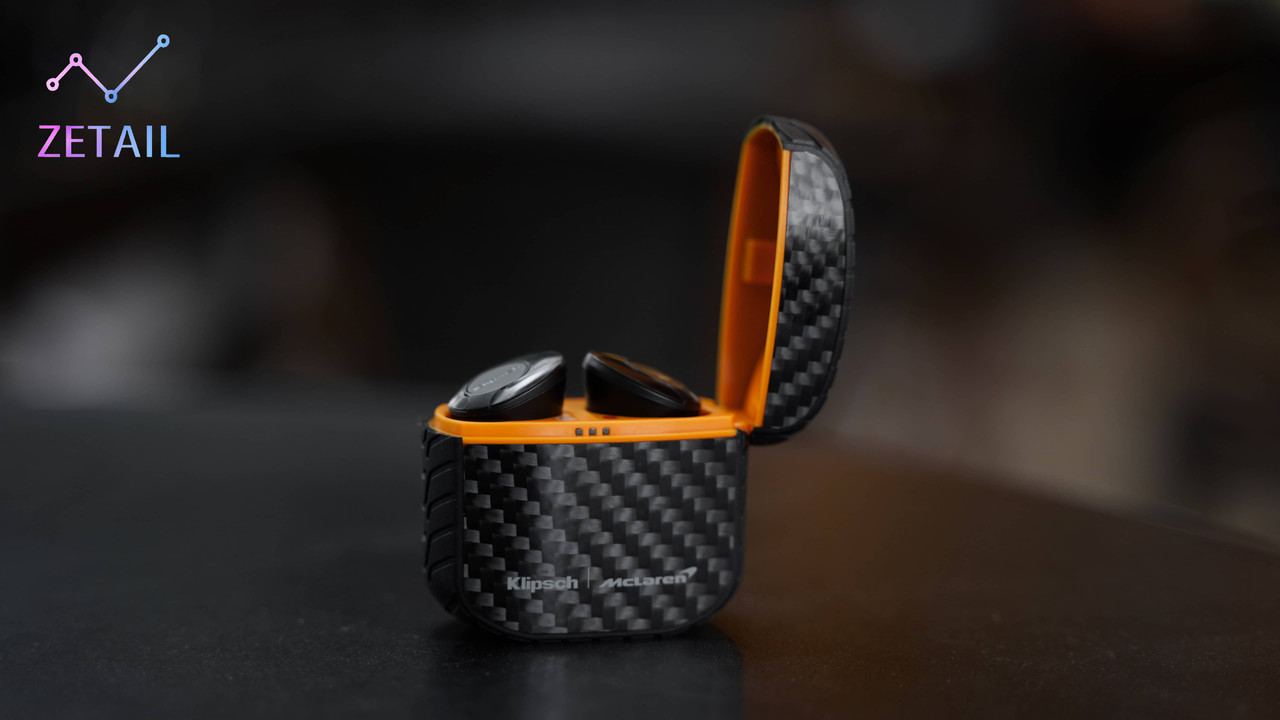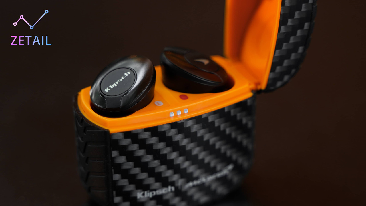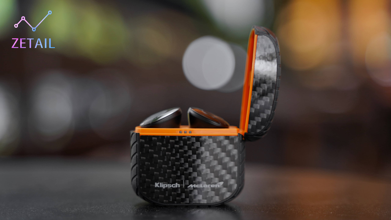 除了碳纖維材質、輪胎紋路,Klipsch 也刻意在 T5 II ANC 充電盒的上、下蓋銜接處以及內部使用 McLaren 標誌性的「木瓜橙」配色進行點綴、裝飾,強化聯名的連結。T5 II ANC 的充電盒體積不大,隨身攜帶放在口袋、包包都很方便。