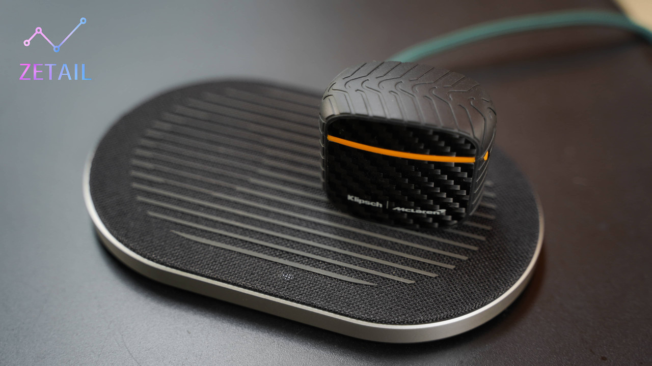 ▲ Klipsch 特地在包裹著充電盒外框的橡膠材質加入立體輪胎紋路,增強跑車的感覺。