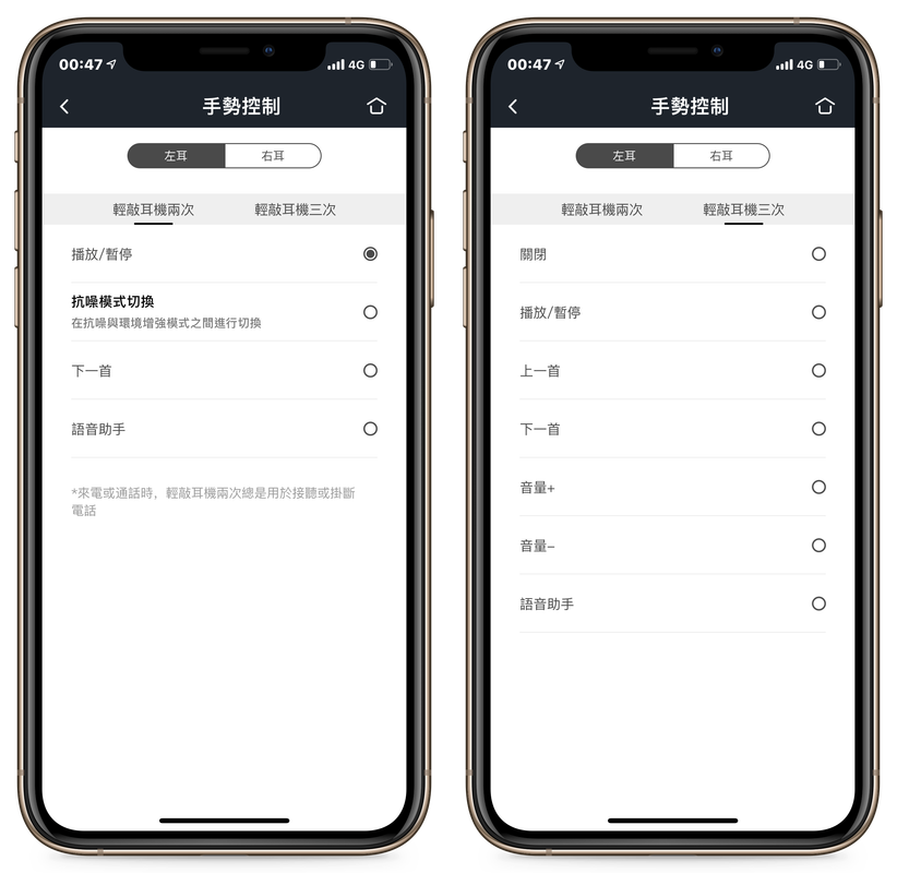 ▲ 目前 TRACK Air+ 的觸控手勢共有「輕點兩下」和「輕點三下」,你可以分別對左、右耳設定這兩個手勢要觸發的功能。