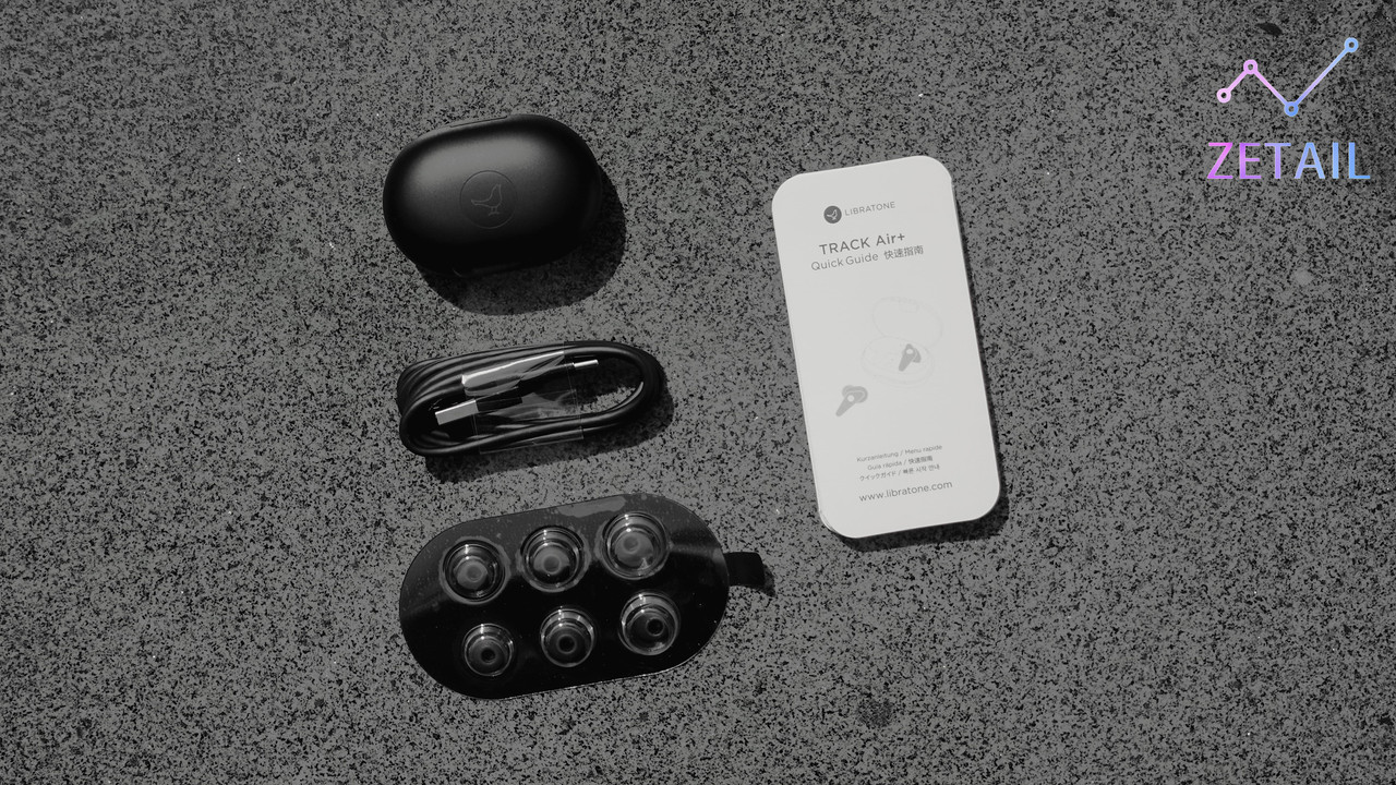 ▲ 盒裝中的內容物如上圖,包括 TRACK Air+、一條 USB Type-C 充電線 (沒有 Libratone 的 Logo)、四組不同大小矽膠耳塞 (一組已經在耳機上)、一些快速上手指南 / 保證卡…等紙本文件。