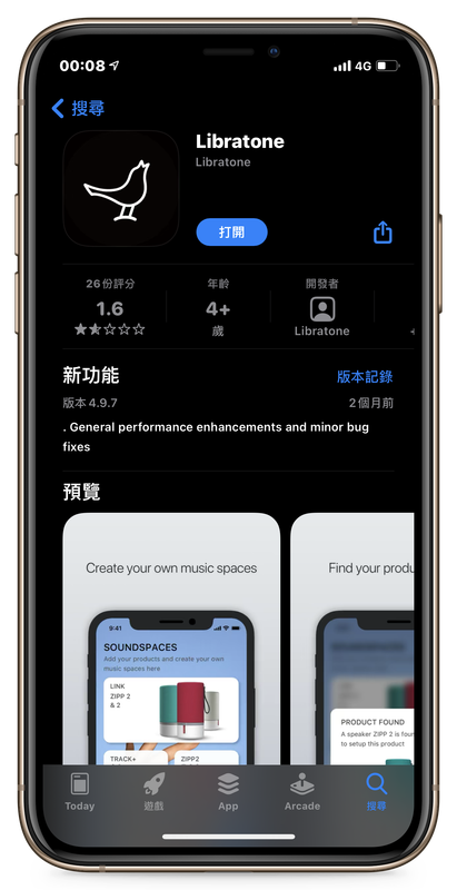Libratone 有為 TRACK Air+ 提供專屬應用程式,因為自家其它產品也是藉由這個應用程式來控制、設定,因此名稱就叫做「Libratone」,而且同時支援 iOS (點我跳轉至 App Store 下載) 與 Android (點我跳轉至 Play 商店下載) 兩大平台。不過 Libratone 應用程式在 App Store 和 Play 商店的評分都偏低,我在使用過程中也遇到過幾次閃退,希望 Libratone 能多花點心思在「Libratone」上面。
