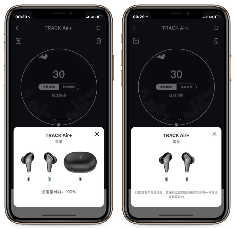 ▲ 把一邊耳機拿出來、一邊留在充電盒內可以同時看到兩隻耳機和充電盒各自的電量 (左圖);如果把兩邊耳機都拿出來,則無法看到充電盒的剩餘電量 (右圖)。