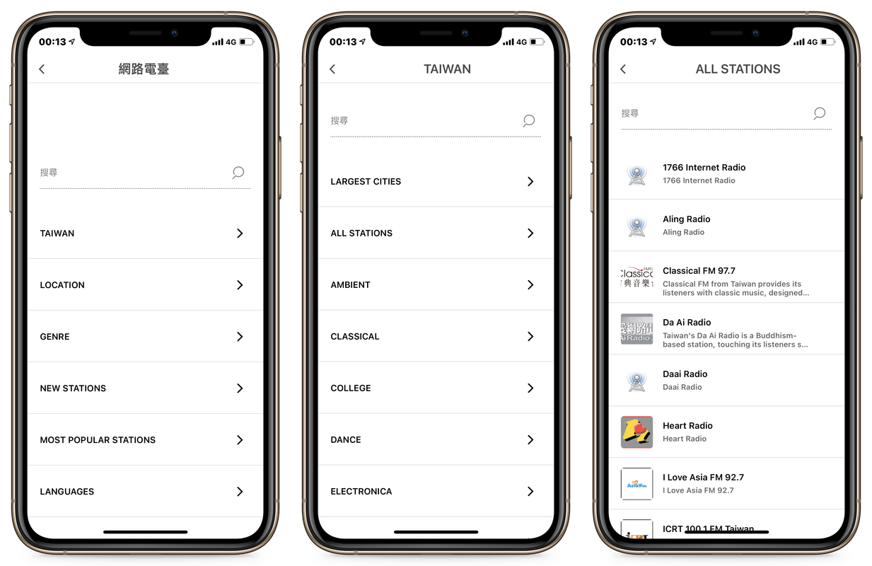 ▲ 點進「網路電臺」之後,你可以根據電臺的地區、類型、熱門程度、語言…等類別進行選擇,像是臺灣的電臺數量就不少,只是不一定每個都能收聽。