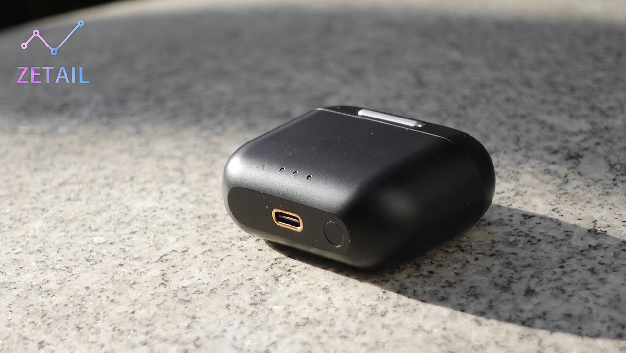 ▲ 充電盒底部有一個 USB Type-C 插槽和多功能按鍵(按一下可以顯示充電盒剩餘電量、長按可以重新配對),而前者的邊緣也有金色的裝飾設計。