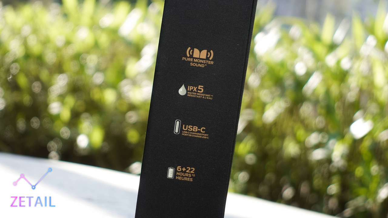 ▲ 盒裝側面整理了四個關於 Clarity 6.0 ANC 的特色和規格,包括使用「Pure Monster Sound」調音技術、具備 IPX5 防潑水能力、使用 USB Type-C 充電、可以提供 6(耳機本身)+ 22(搭配充電盒使用)小時的續航能力…等。