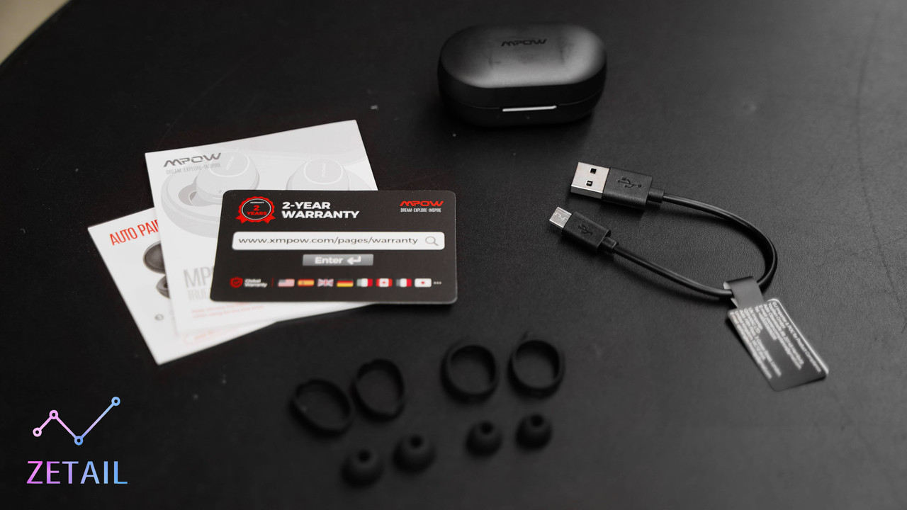 ▲ 盒裝內所有內容物如上圖,包括 MDots 耳機、一條沒有 Logo 的 Micro USB 充電線、三組不同尺寸的耳塞與耳翼(其中一組在耳機上)、快速上手指南、保固卡。