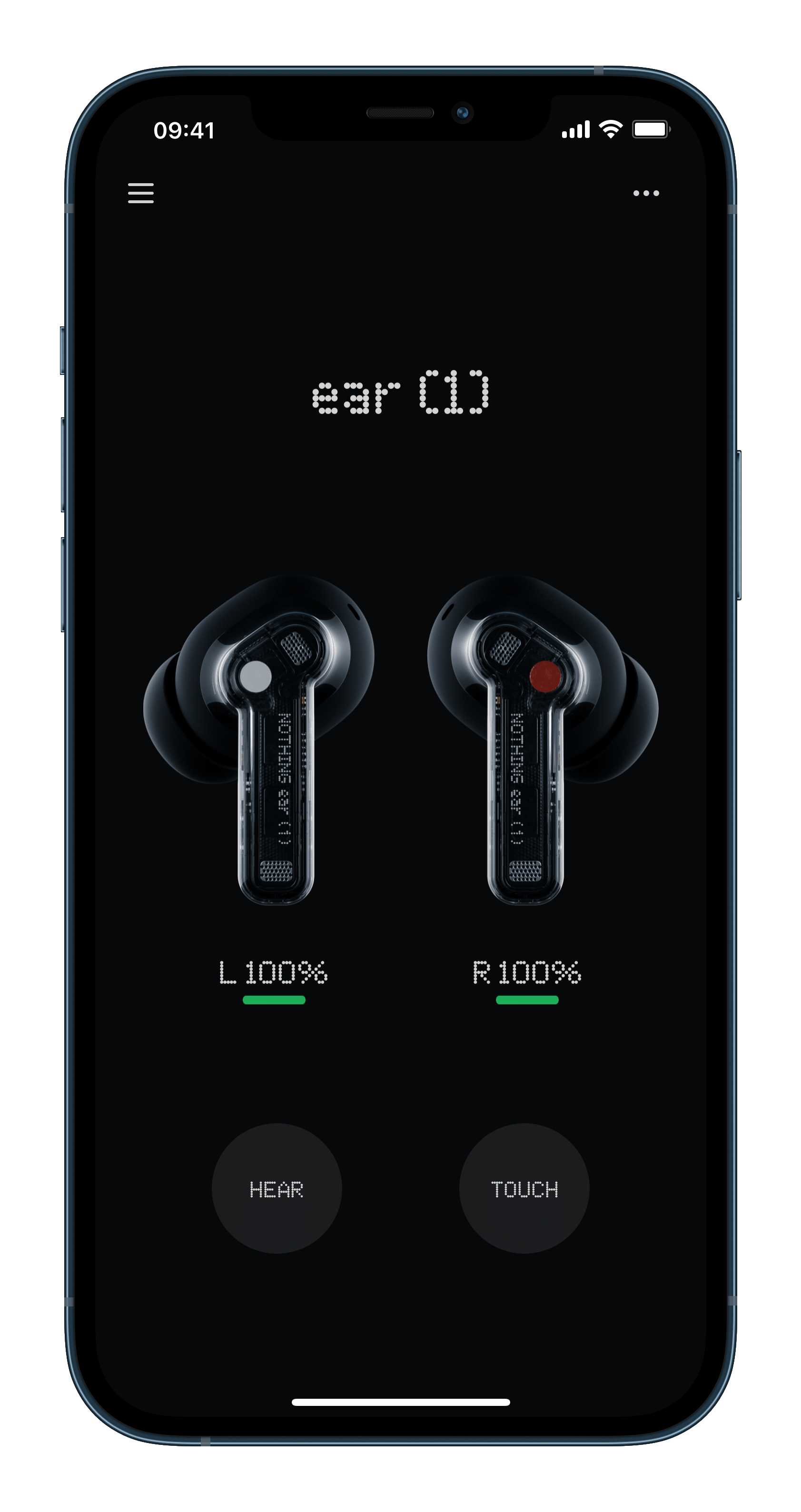 ▲ 跟耳機連線之後的主畫面,中央可以看到兩邊耳機各自的剩餘電量,下方有一個「HEAR」跟一個「TOUCH」按鈕。