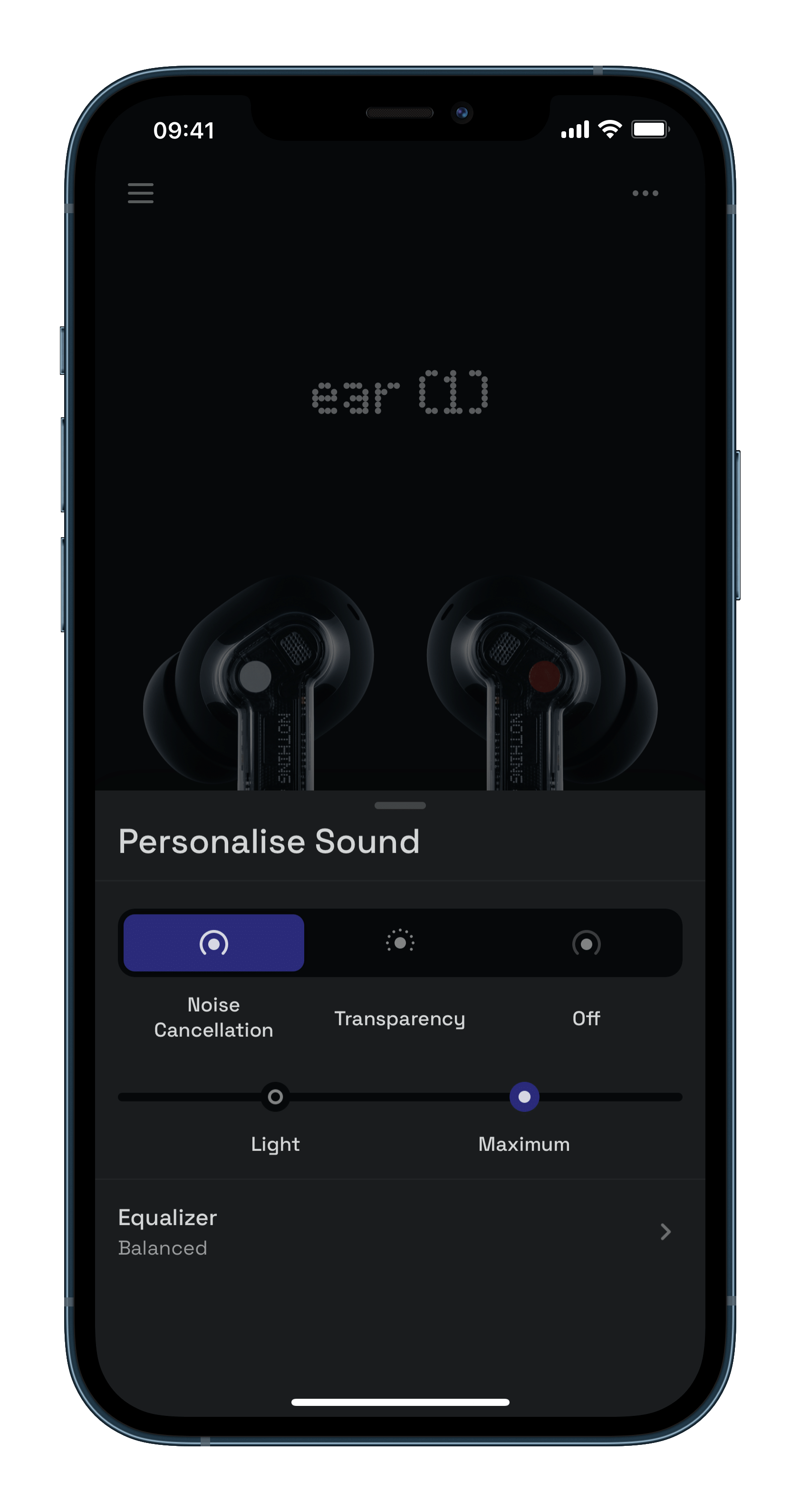 ▲ 在專屬應用程式可以調整 ear (1) 主動降噪的強度,分為「輕度」(Light)跟「最強」(Maximum)兩種。