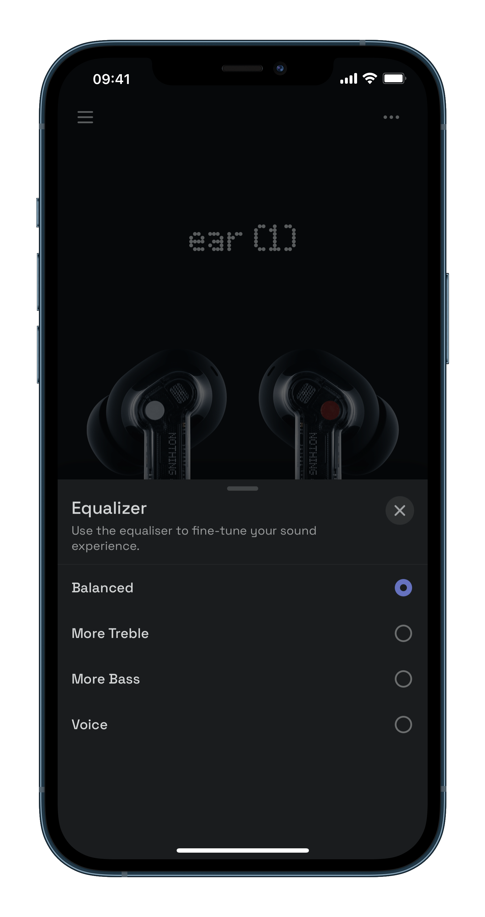 如果你不太滿意 ear (1) 現在的聲音也沒關係,在「ear (1)」應用程式中也內建了四種預設的等化器,分別是「均衡」(Balanced)、「加強高頻」(More Treble)、「加強低頻」(More Bass)、「人聲」(Voice),每個等化器的風格、效果都很明顯,不過它並不能讓使用者建立自己的等化器,希望未來有機會加入。