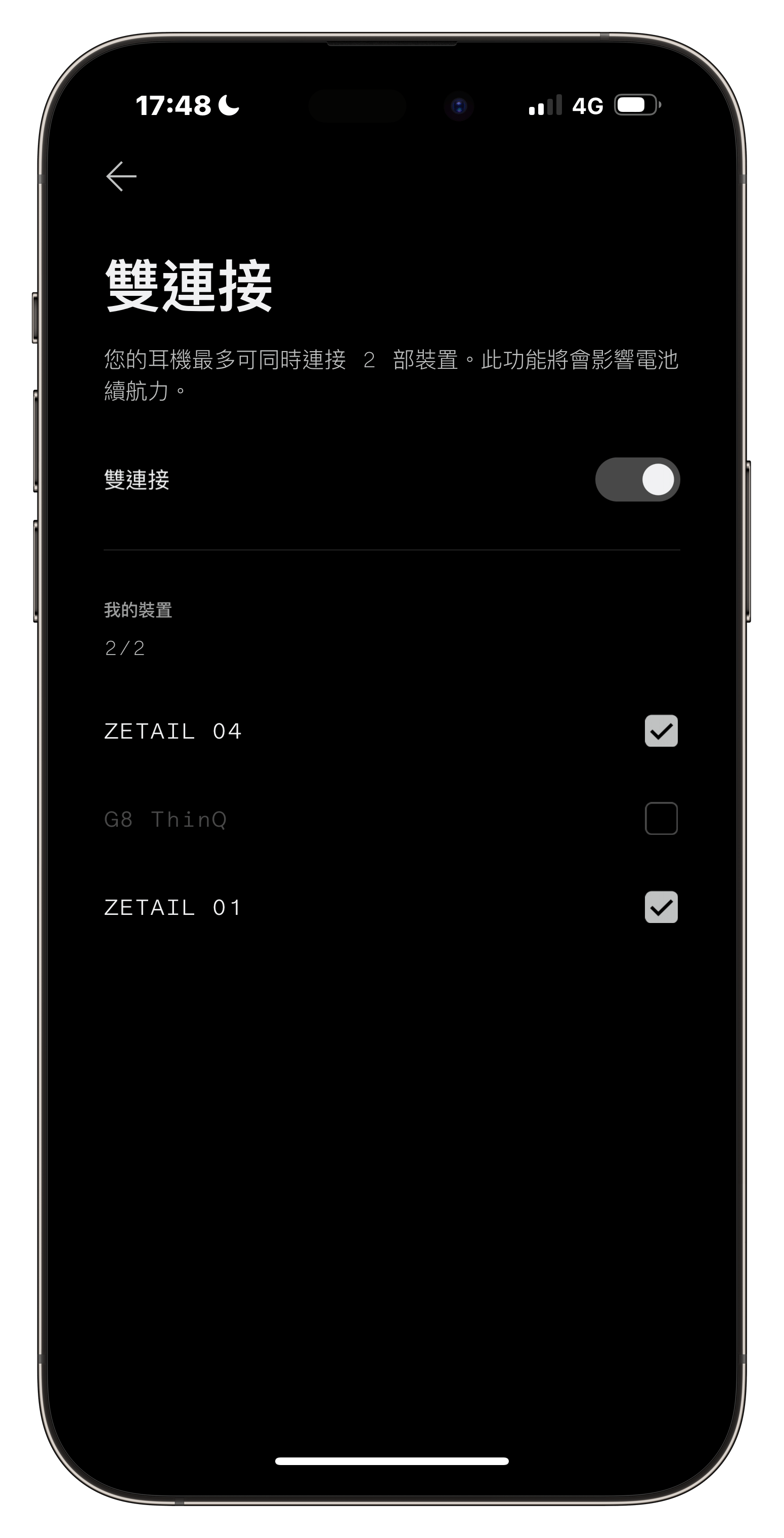 ▲ 「雙重連線」功能要在「Nothing X」App 裡面手動打開。開啟後,下面會列出 Ear (2) 最近連線過的幾款裝置,你可以從中選擇兩款。