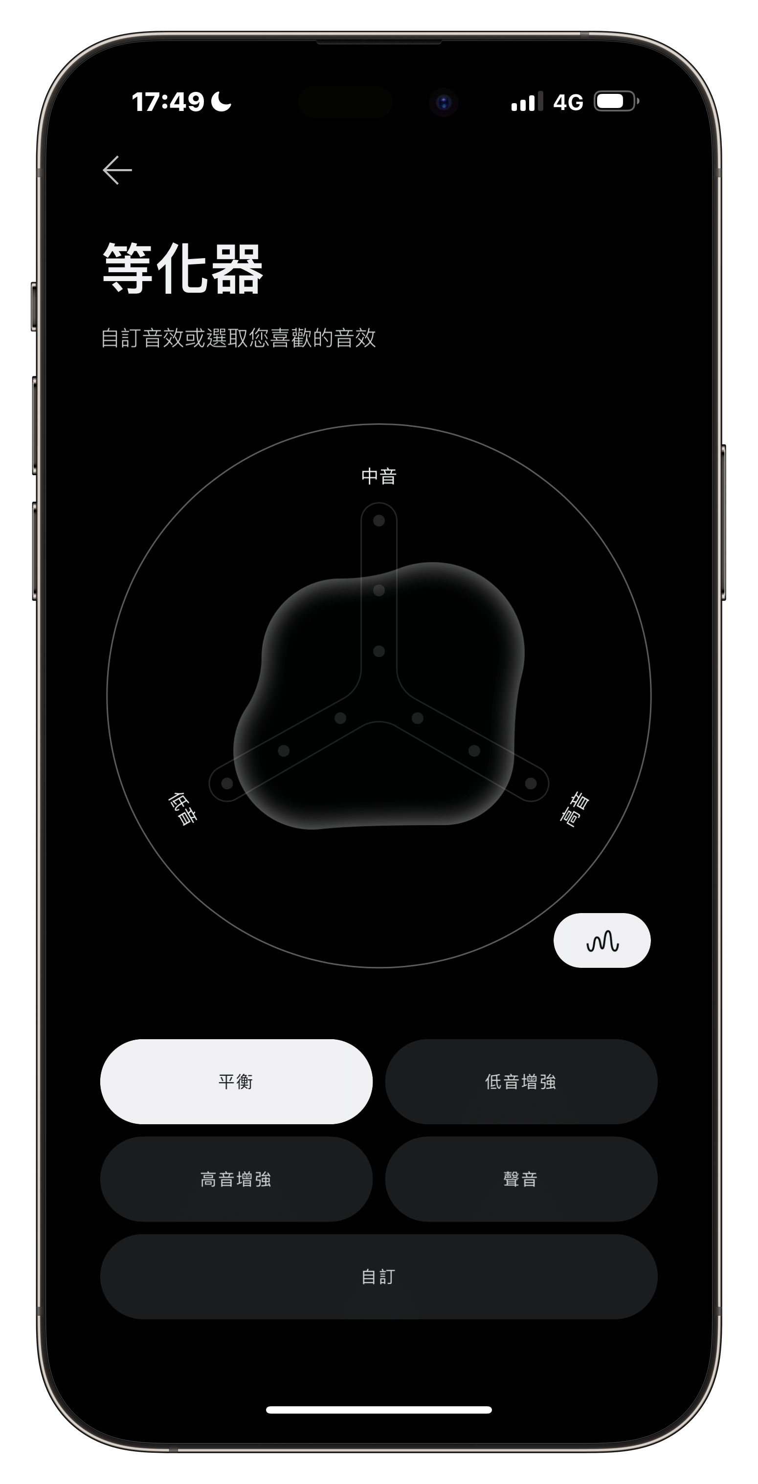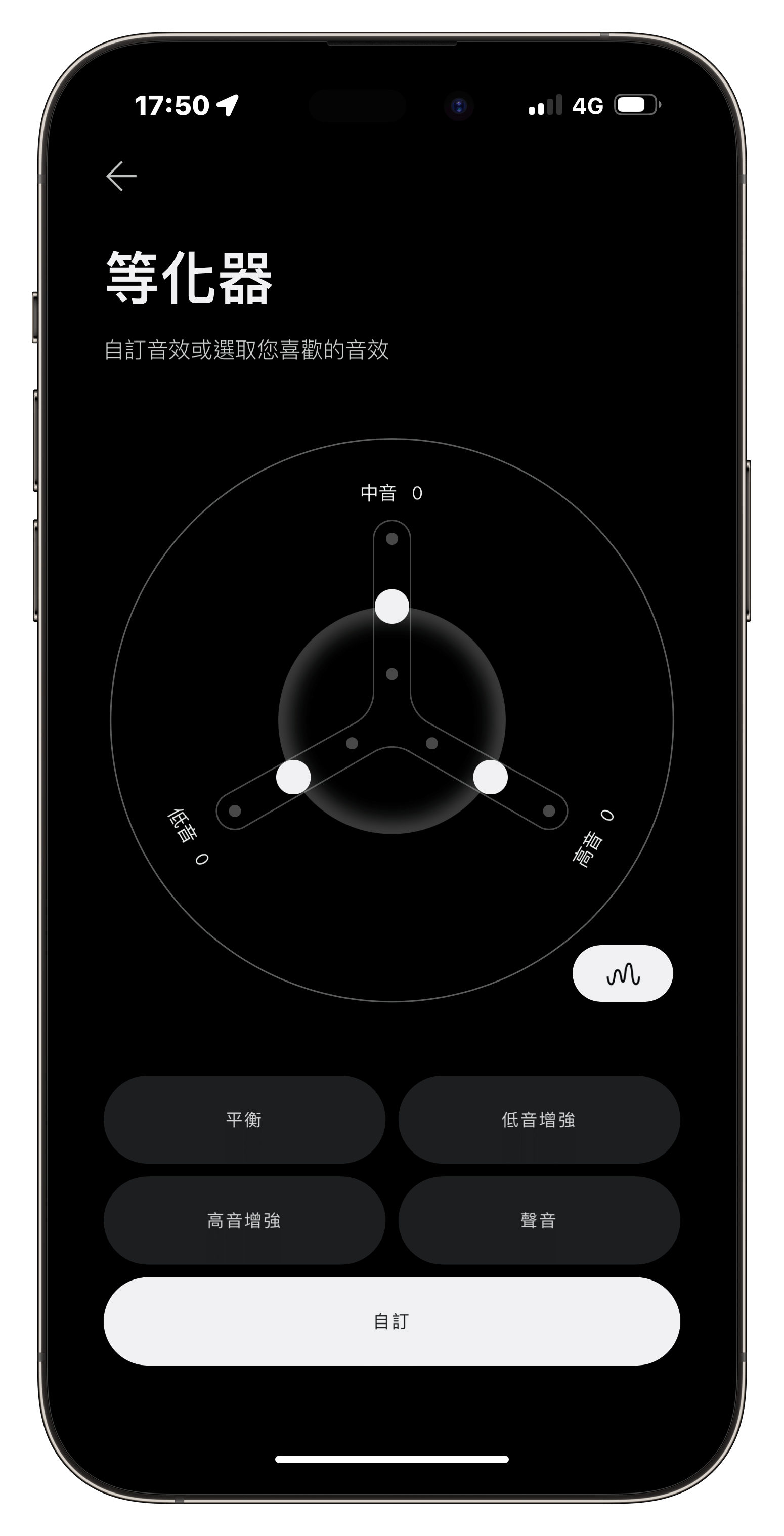 除了「聲音個人化」,「Nothing X」App 也內建「等化器」功能,可以調整 Ear (2) 的聲音。預設有「平衡」、「低音增強」、「高音增強」、「聲音」四種 EQ;如果這些都不合胃口,你也能選擇「自訂」來手動調整低音、中音、高音的多寡,調音彈性滿大的。