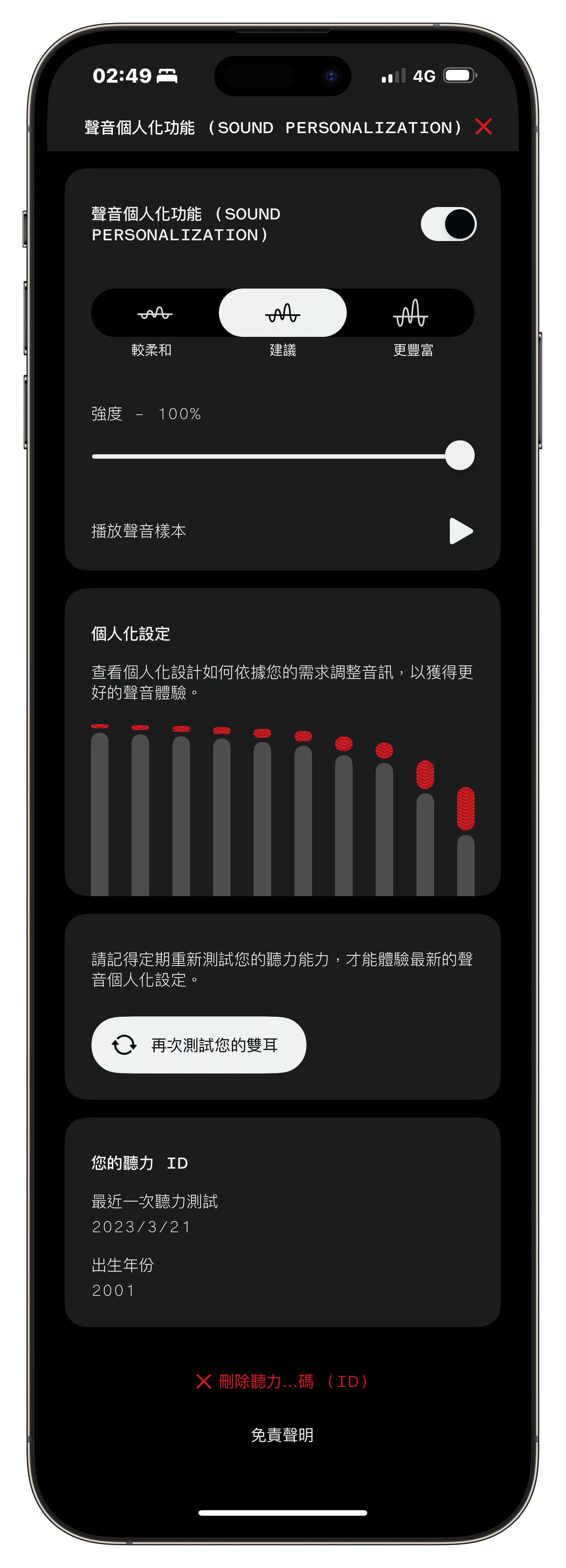 Ear (2) 新加入了「聲音個人化」功能,很類似 soundcore 的 HearID 或 1MORE 的 SoundID,總之就是耳機會測試你對不同頻段聲音的聽力情形,再針對比較不敏感的部分予以增強,讓你能完整聽到音樂中的細節。打開「聲音個人化」之後的差異非常明顯,會發現不同聲音之間的距離被拉開,音樂聽起來更立體、深沉,我覺得效果比 HearID、SoundID 還要好,值得一試。