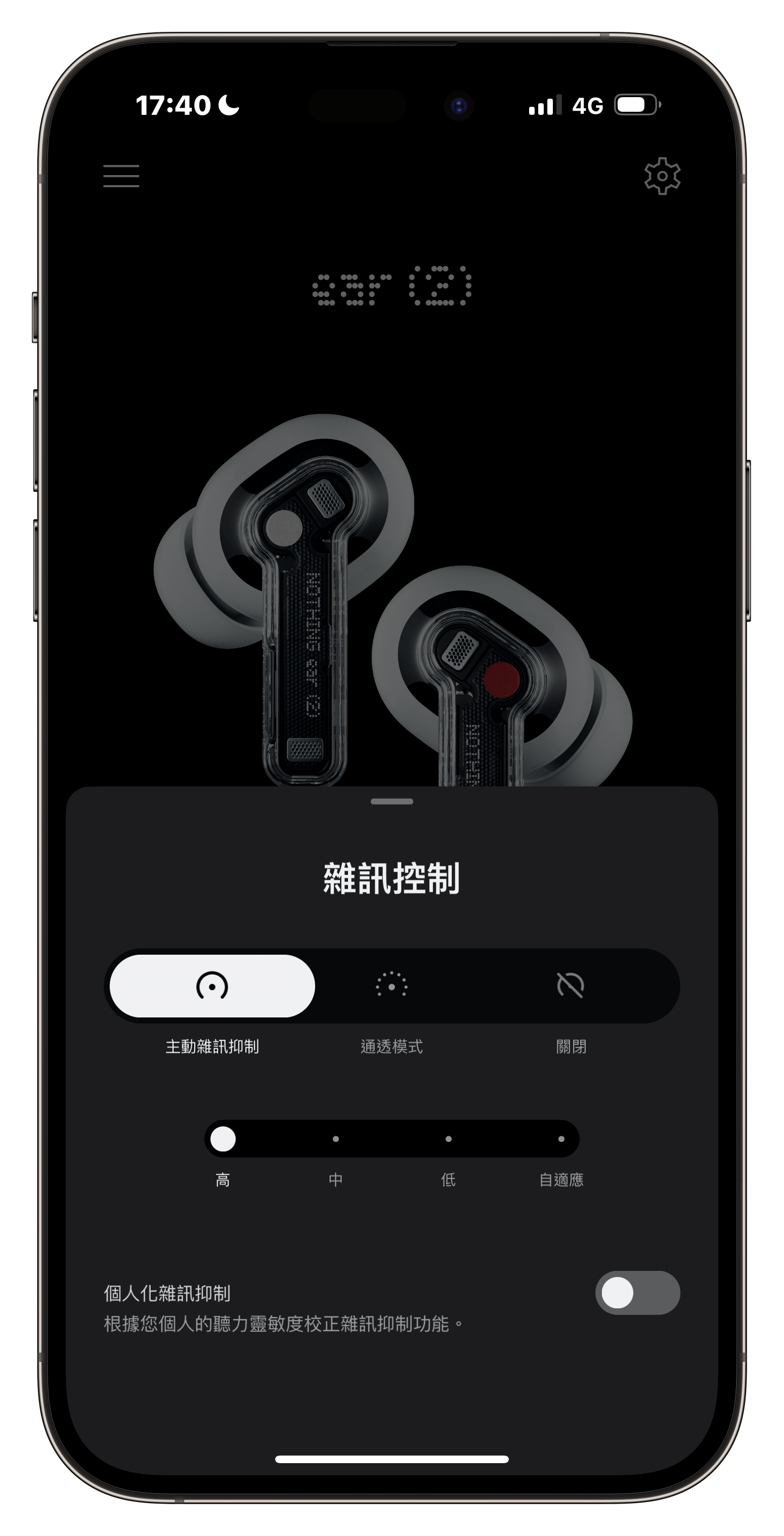 ▲ Ear (2) 的主動降噪除了「高」、「中」、「低」三個固定強度外,還有「自適應」可以讓耳機自行判斷當下需要的降噪強度。