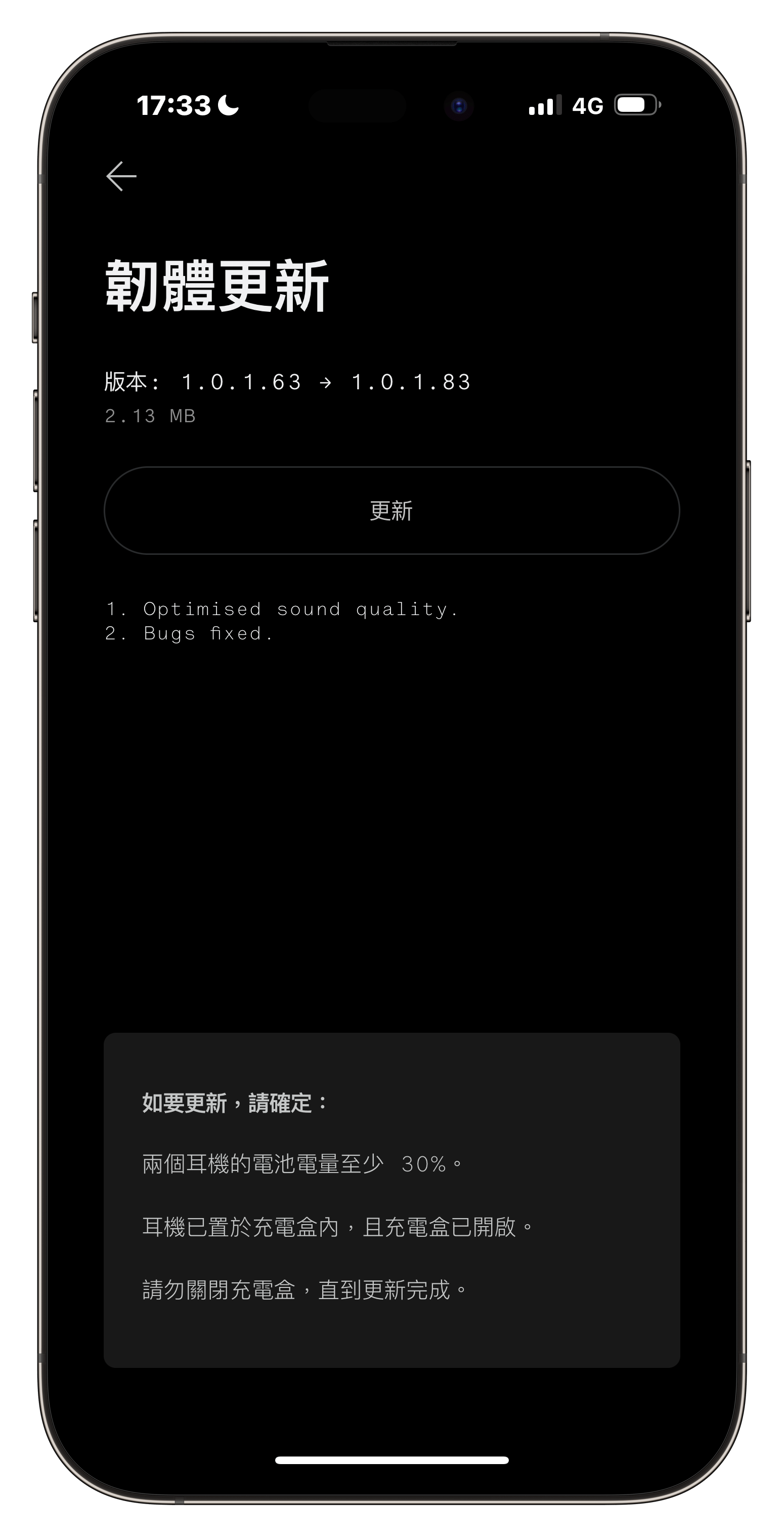 ▲ 第一次將 Ear (2) 跟「Nothing X」App 連線的時候就有收到耳機的韌體更新。