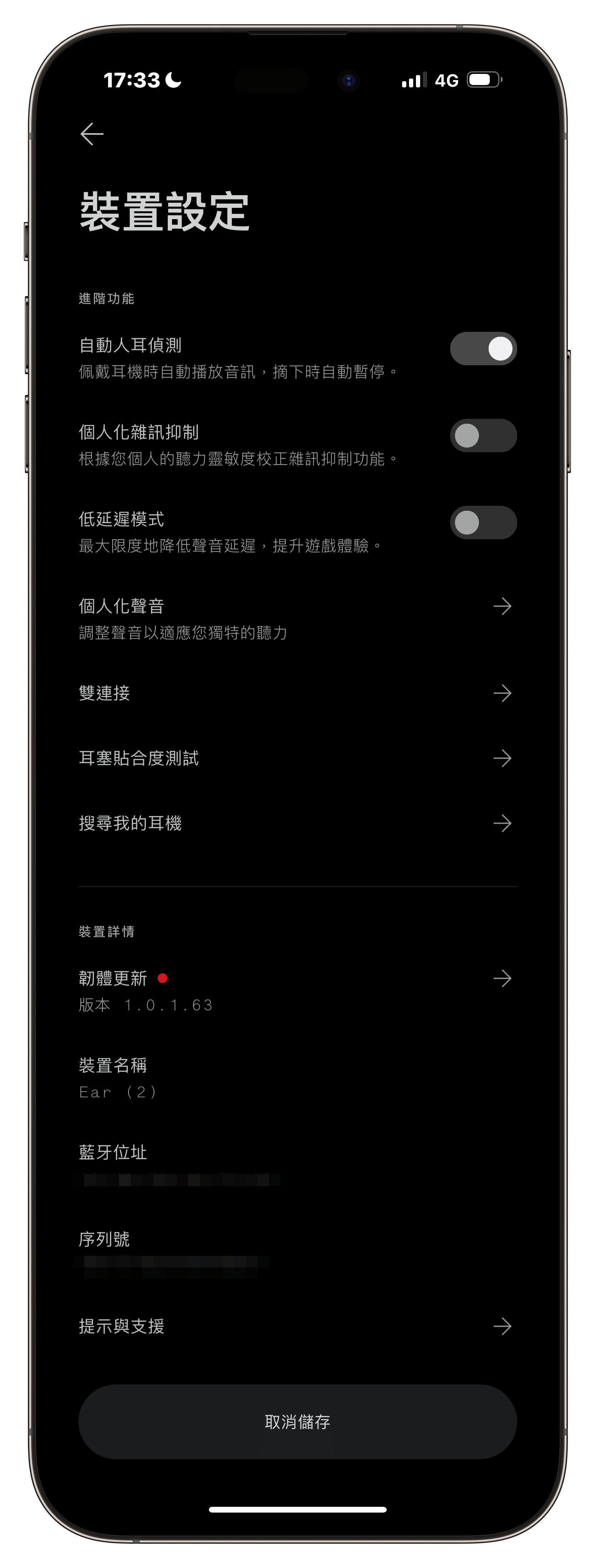 ▲ 點開設定,可以找到更多的功能與選項,還有 Ear (2) 的詳細資訊。