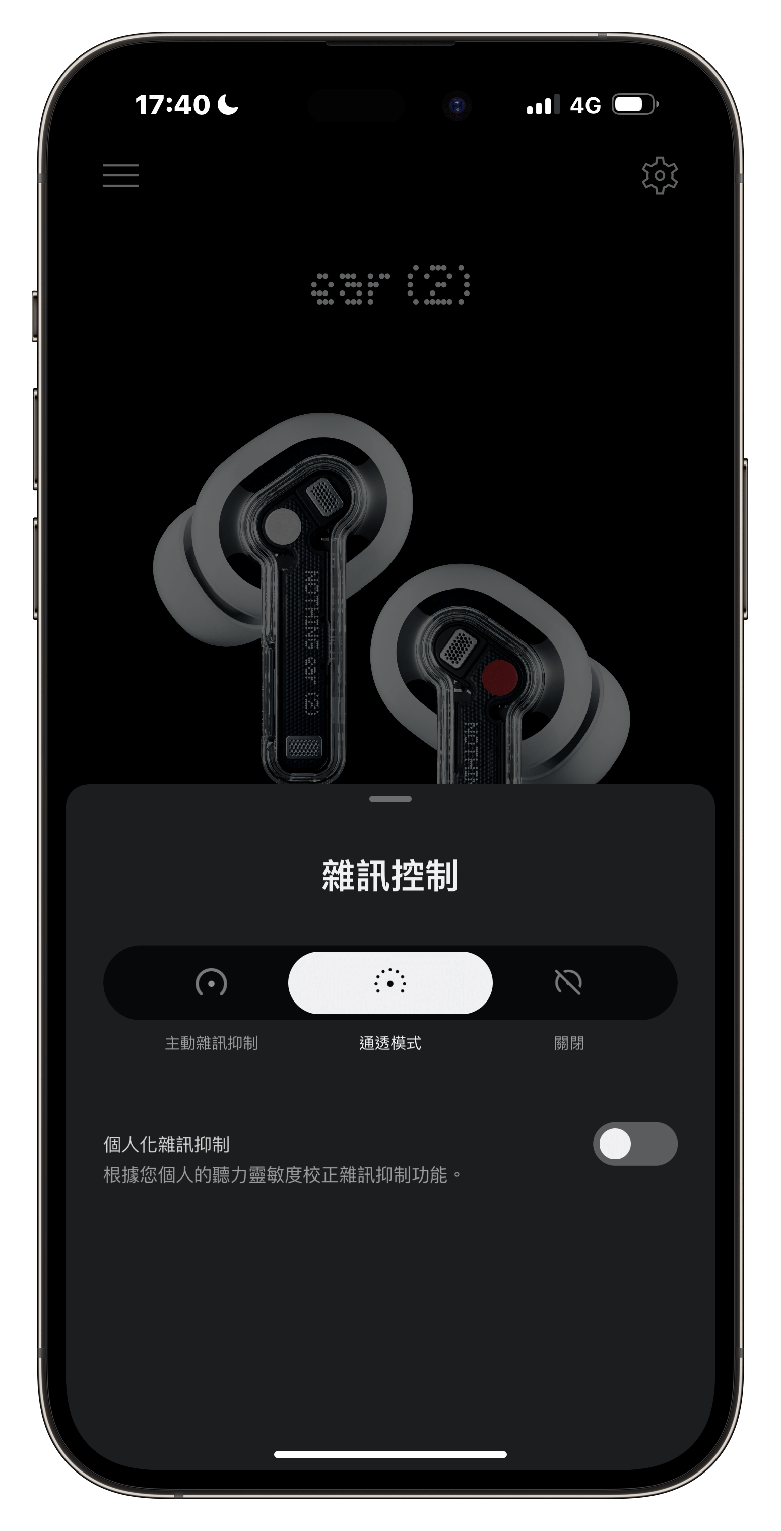 Ear (2) 主動降噪比較大的問題是會有一些底噪,這有待 Nothing 未來透過韌體更新來改善。但我也發現,打開個人化主動降噪之後,底噪會小很多,降噪效果則沒有太大差異,所以我都一直開著它。此外,Ear (2) 還有個「自適應」調整降噪強度的模式,也就是耳機會偵測你所在的環境噪音量,環境越吵,降噪強度越高;反之,環境越安靜,降噪強度也會自動降低。
