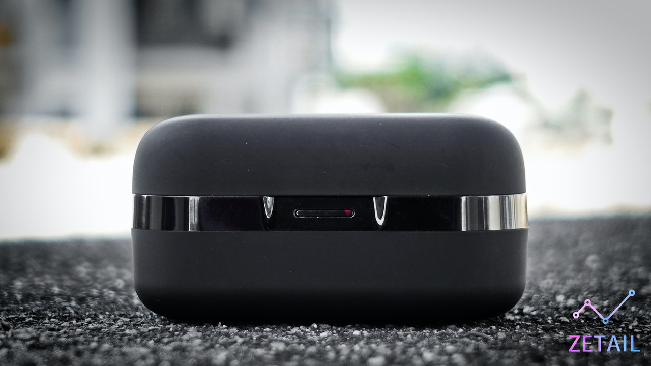 ▲ 充電盒正面有 LED 提示燈,仔細看的話可以看到右邊那顆是亮的,表示右邊的耳機正在充電,而左邊的已經充飽了。