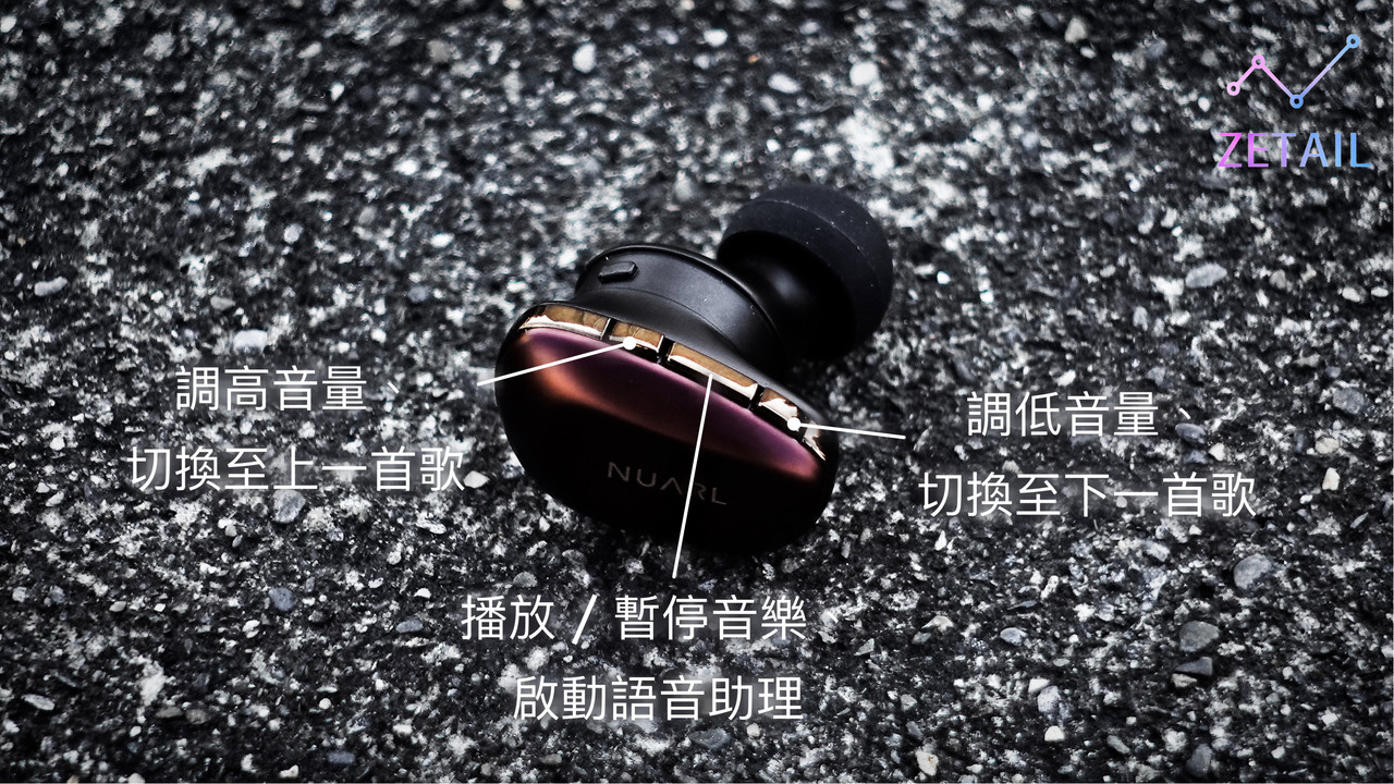 NUARL 同樣沒有替 N6 Pro 設計專屬的應用程式,所以功能非常單純,沒有什麼可以自訂的。在音樂的控制方式上,N6 Pro 還是延續 NUARL 的傳統,採用實體按鍵控制,不過有別於 NT110 與 NT100 直接將 Logo 的區域作為隱藏式按鍵,這次則是把按鍵移動到金色中框上,相信一方面是為了避免按下導致耳朵不適,另一方面則是為了容納更多按鍵 - 是的,N6 Pro 的單邊耳機都各有多達三顆按鍵。