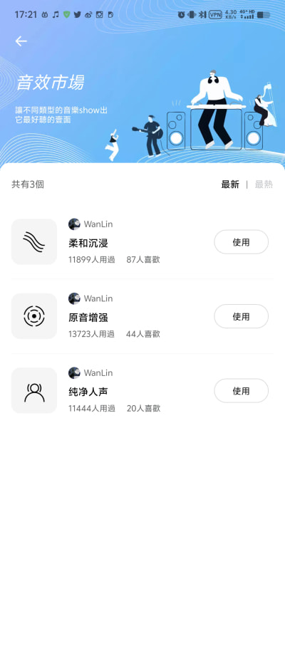 ▲ 它甚至還有個「音效市場」,應該是可以下載別人製作的等化器。但目前似乎只有三種,而且都來自同一個人,不知道未來會不會開放使用者上傳自己的等化器。