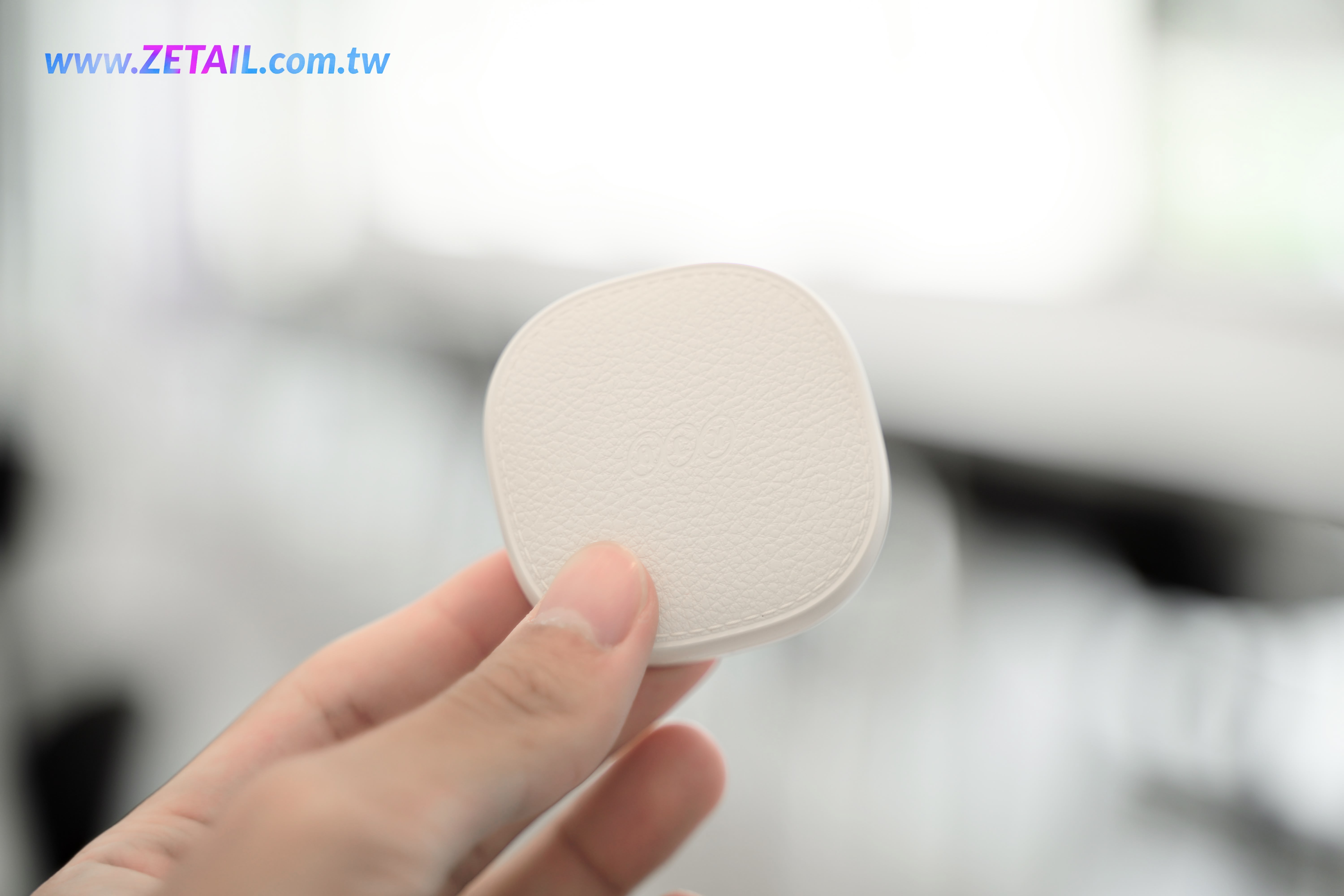 ▲ 這就是 Air 的充電盒啦!頂部覆蓋著一層皮革質感的紋理,而且四周還有縫線設計,中間則是壓印的 logo,質感真的很棒。