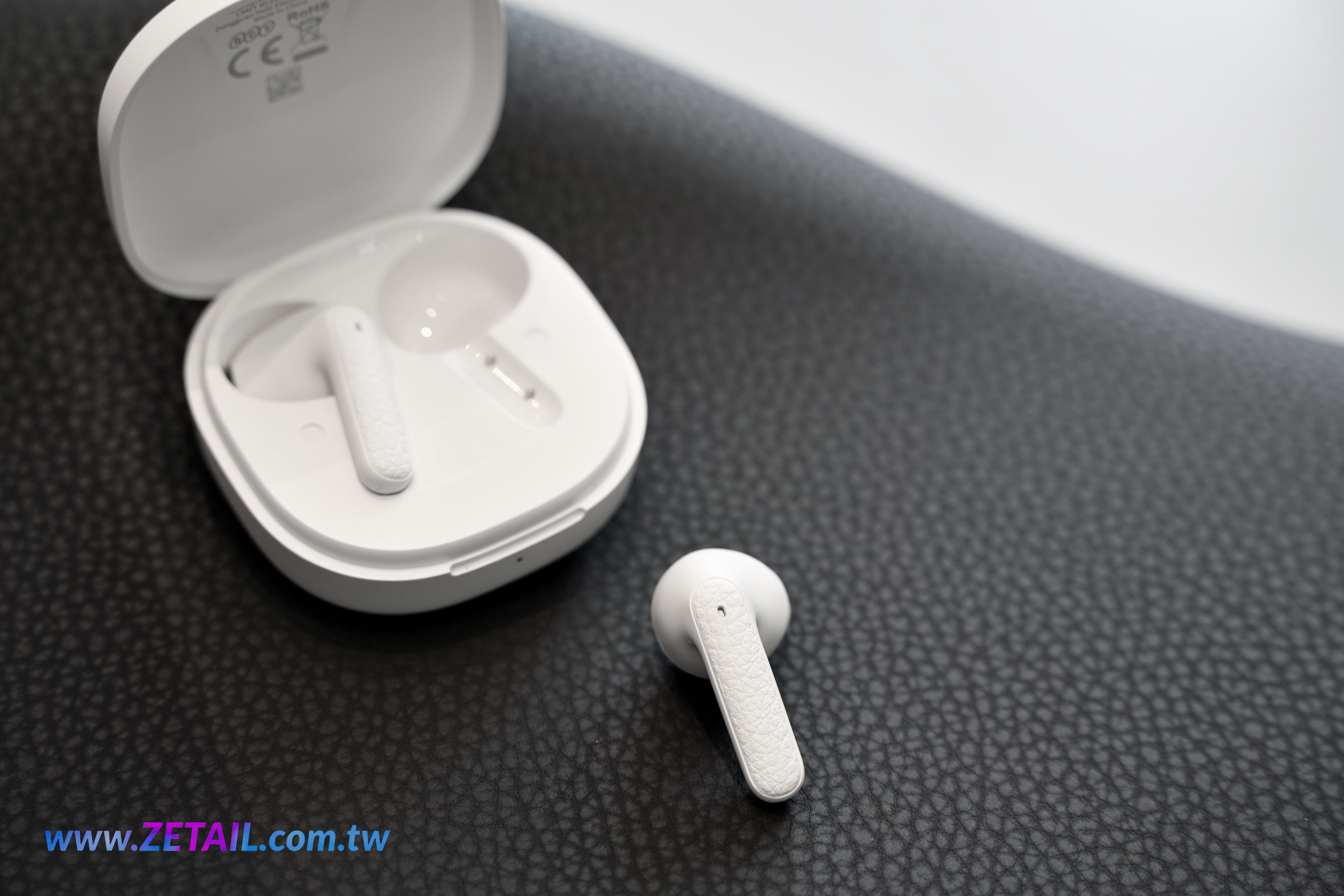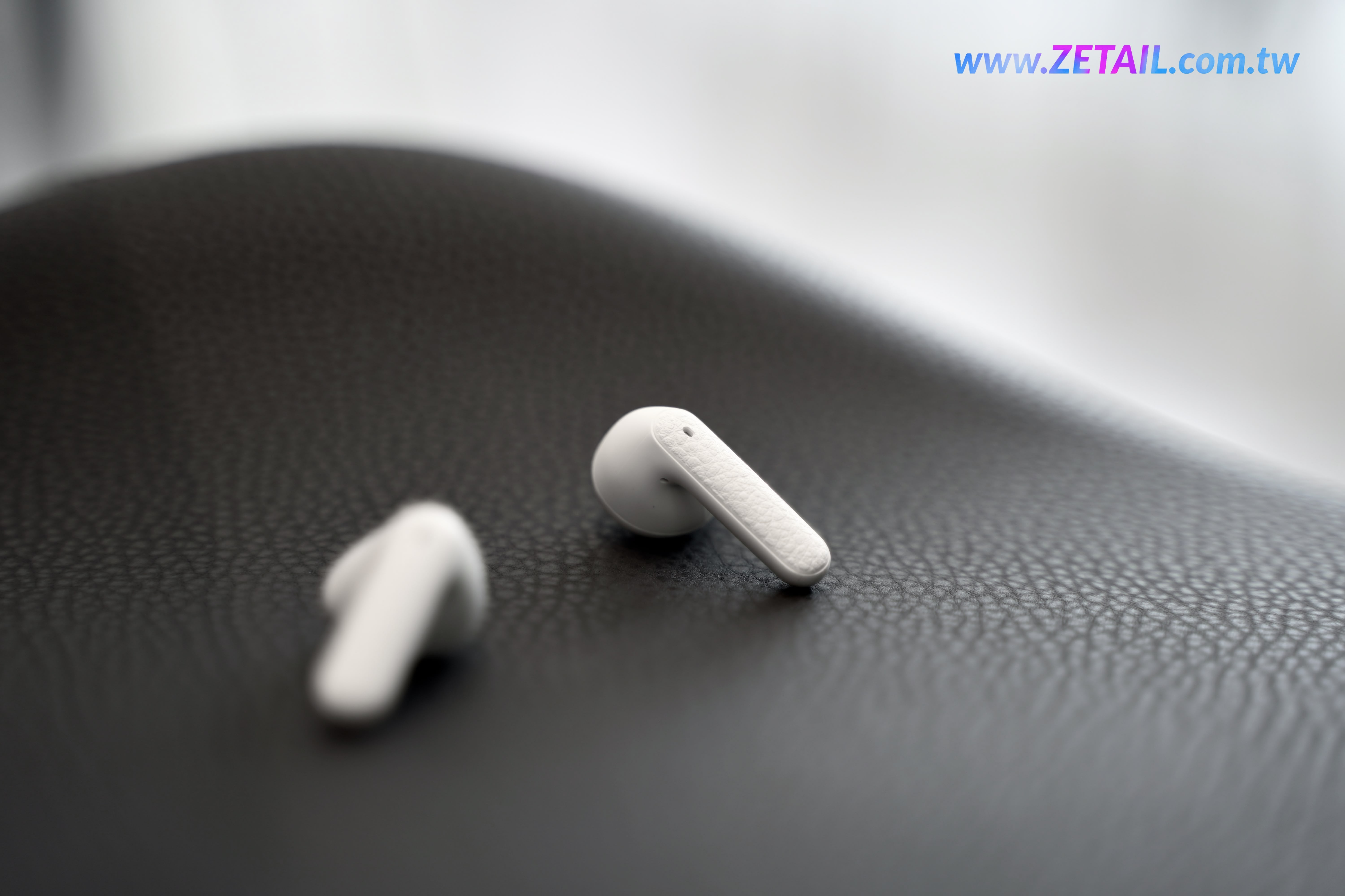 Air 的耳機造型類似第一代蘋果 AirPods,都有收音指向桿,但 Air 顯然更小巧;值得留意的是,收音指向桿的背板也採用跟充電盒相同的皮革質感紋路,為原本平凡無奇的耳機外觀增添不少設計感和特色,可說是妝點地恰到好處。耳機的其他部分則是一般的霧面塑膠材質,合模線也比較明顯,但考量到 Air 的售價、定位,目前的質感、組裝品質已經是在水準之上。