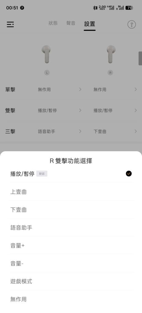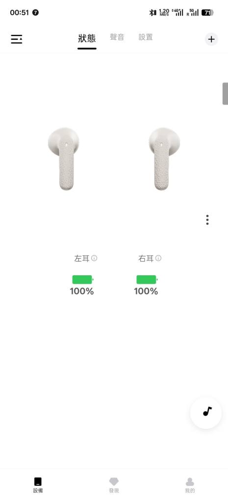▲ 這是耳機跟 app 連線之後的主畫面,可以查看兩邊耳機的剩餘電量。