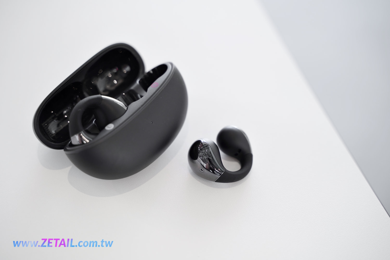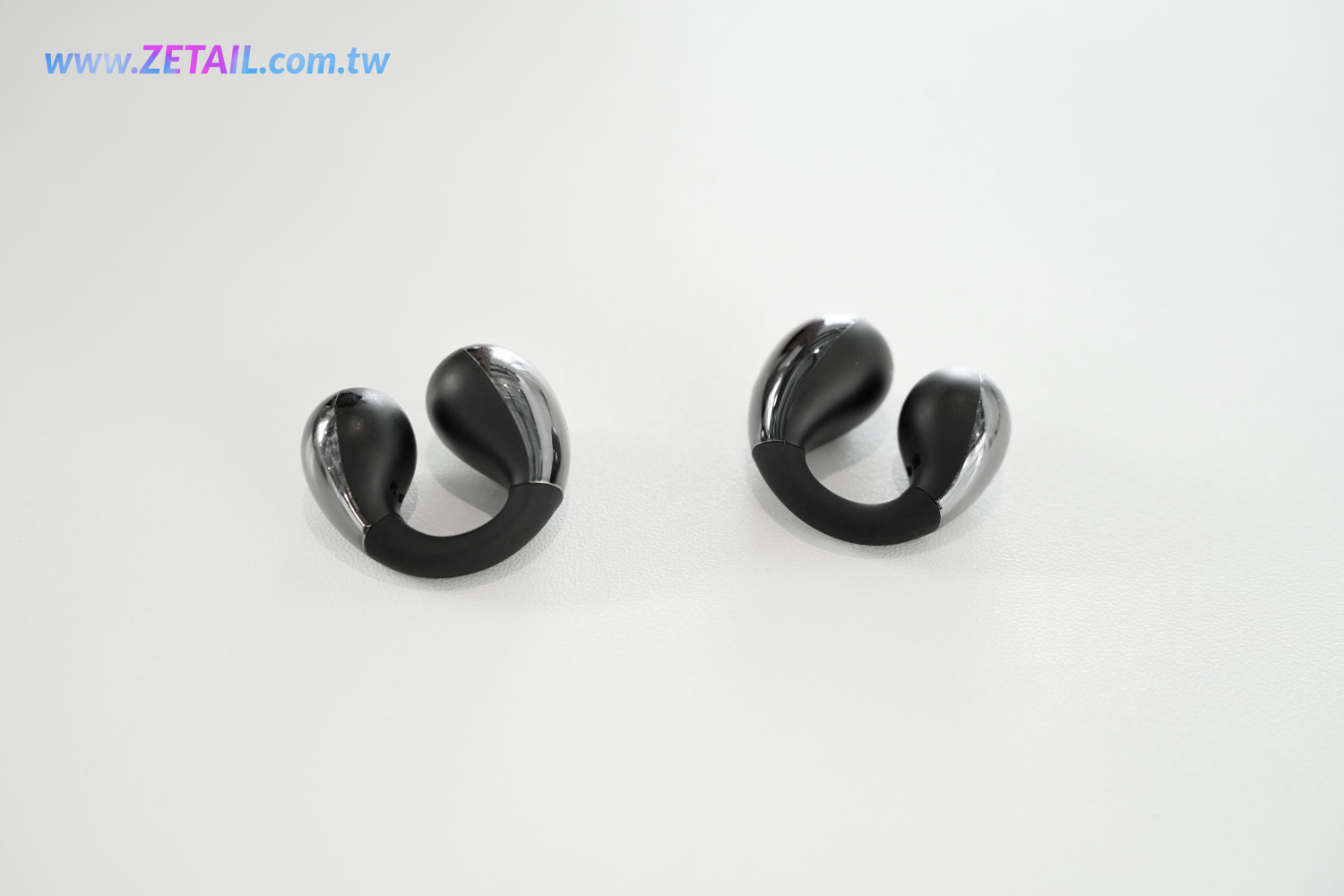 來看到耳機,Crossky C30 的形狀看起來就像是一個英文字母「C」,很小巧玲瓏。有些耳夾式耳機看起來有種廉價感,QCY 做了一些設計來避免這一點,像是他們在耳機的前側和後側用上亮面處理,看起來十分搶眼、吸睛,而且喇叭的網罩設計也挺別緻。因此讓 Crossky C30 的外觀設計其實頗具質感和精緻,以這個價位來說還滿難得的。