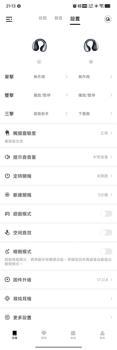 ▲ 進入「設置」的頁面,會看到上圖的畫面,有非常多選擇、功能可以設定和使用,像是韌體(固件)升級、尋找耳機、遊戲模式等。