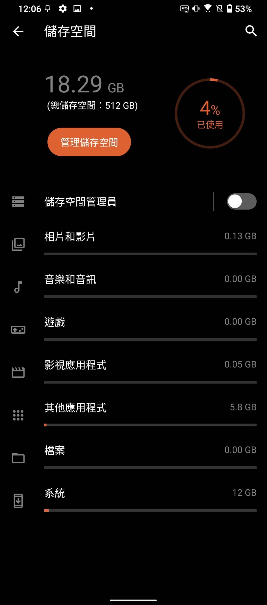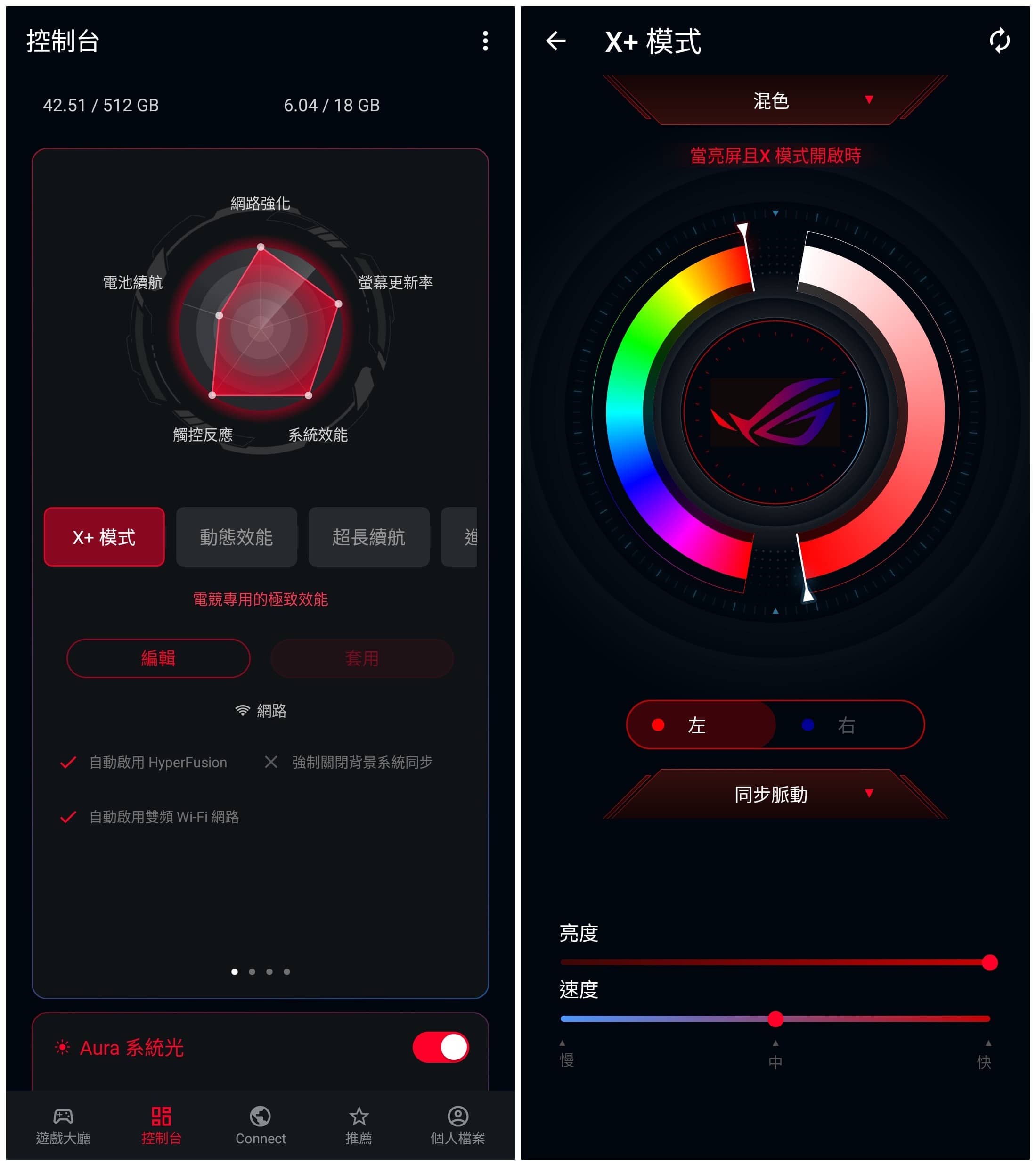 ▲「控制台」頁面的最上方可以看到目前的 CPU、GPU、記憶體、儲存空間用量、手機溫度、電池預計剩餘使用時間…等資訊,也可以切換效能模式,下面還有針對「ROG 幻視螢幕」、「風扇速度」、「遊戲精靈」、「AirTrigger 超音波觸控鍵」的設定選項。
