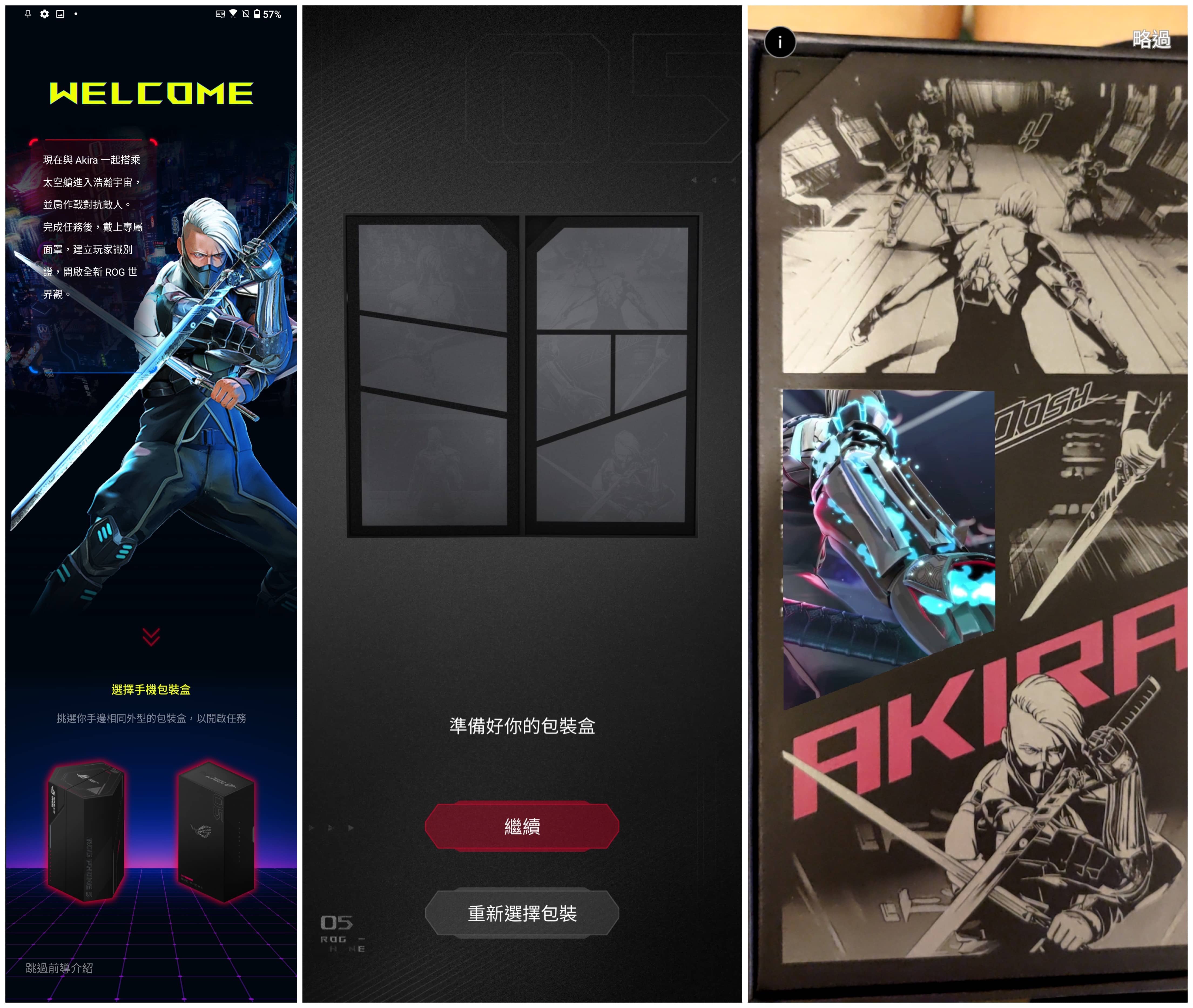 ▲ 5s Pro 的盒裝改採直向的開闔,相比過去更簡便。一打開就可以看到 ROG 品牌形象人物 AKIRA 的漫畫,初次將手機開機時,系統也會引導使用者觀看這個小漫畫,還蠻有趣的。
