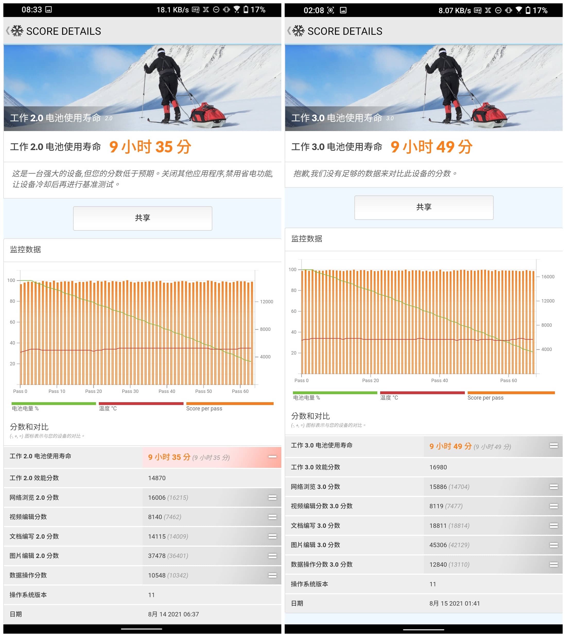▲ 使用「工作 2.0 電池使用壽命」、「工作 3.0 電池使用壽命」測試續航的成績(開啟 X 模式)。