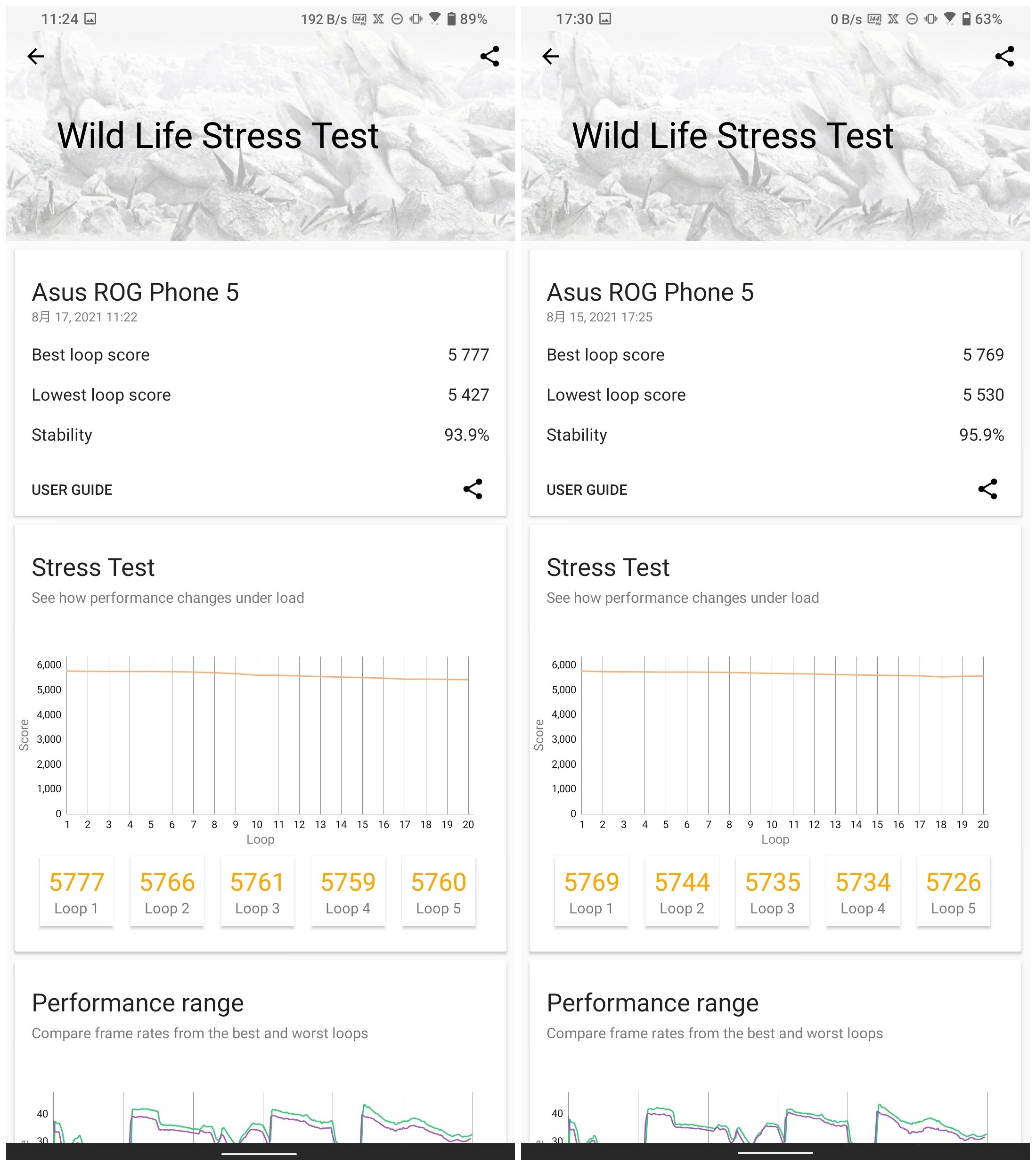 我用 3DMark 的「Wild Life Stress Test」20 分鐘壓力測試(透過模擬手機遊戲來測試手機在長時間、高負載狀況下的性能變化表現)來看看 5s Pro 在裝上「空氣動力風扇 5」前後的差異(開啟 X 模式)。結果裝上前,整體穩定性為 93.9%,裝上後則進步到 95.9%,這表示「空氣動力風扇 5」讓 5s Pro 在這 20 分鐘測試的幀率更穩定,確實有散熱的效果。