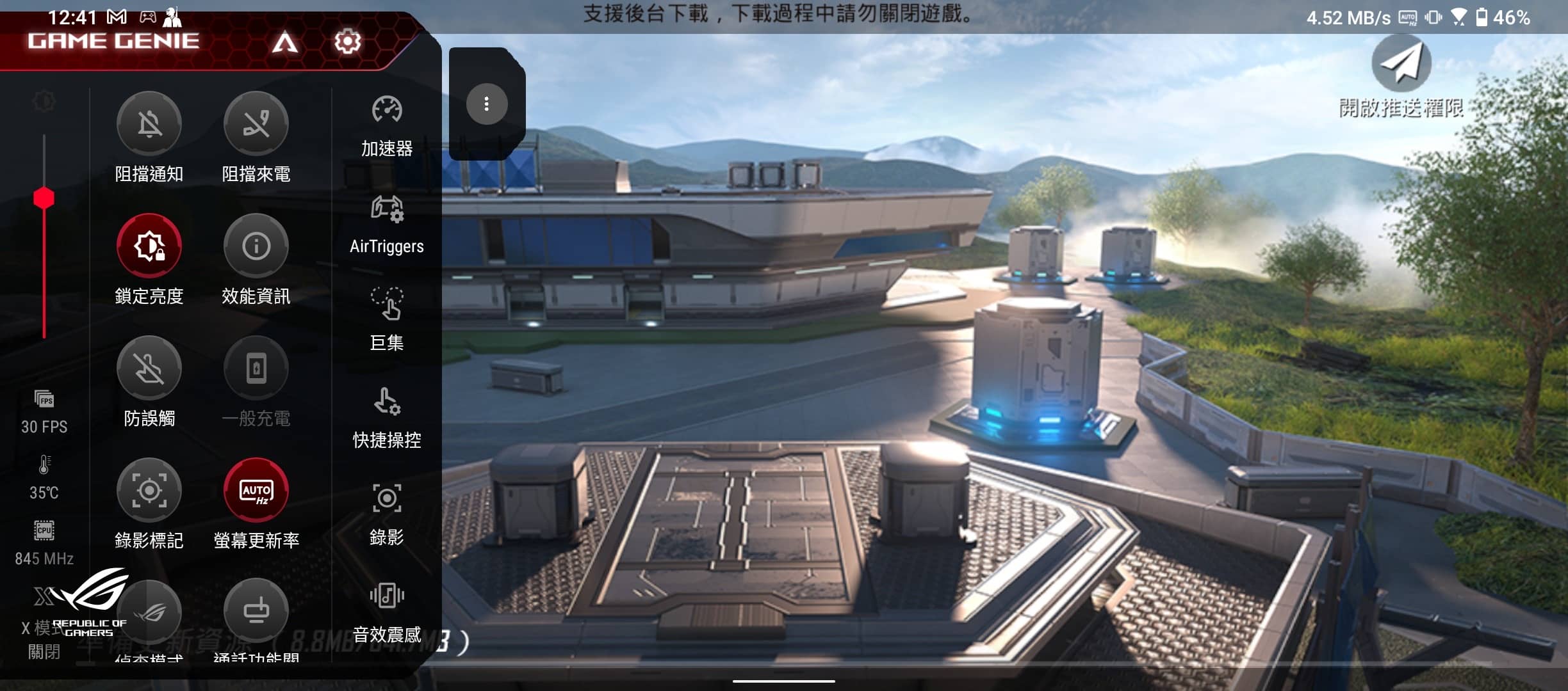 ▲ 在遊戲畫面可以從螢幕左側滑出「遊戲精靈」的面板,所有遊戲相關的功能都在這邊,像是很方便的「鎖定亮度」、「螢幕錄影」、「錄影標記」(啟用後會開始螢幕錄影,之後隨時點選都可以針對設定的秒數進行「回錄」)…等。