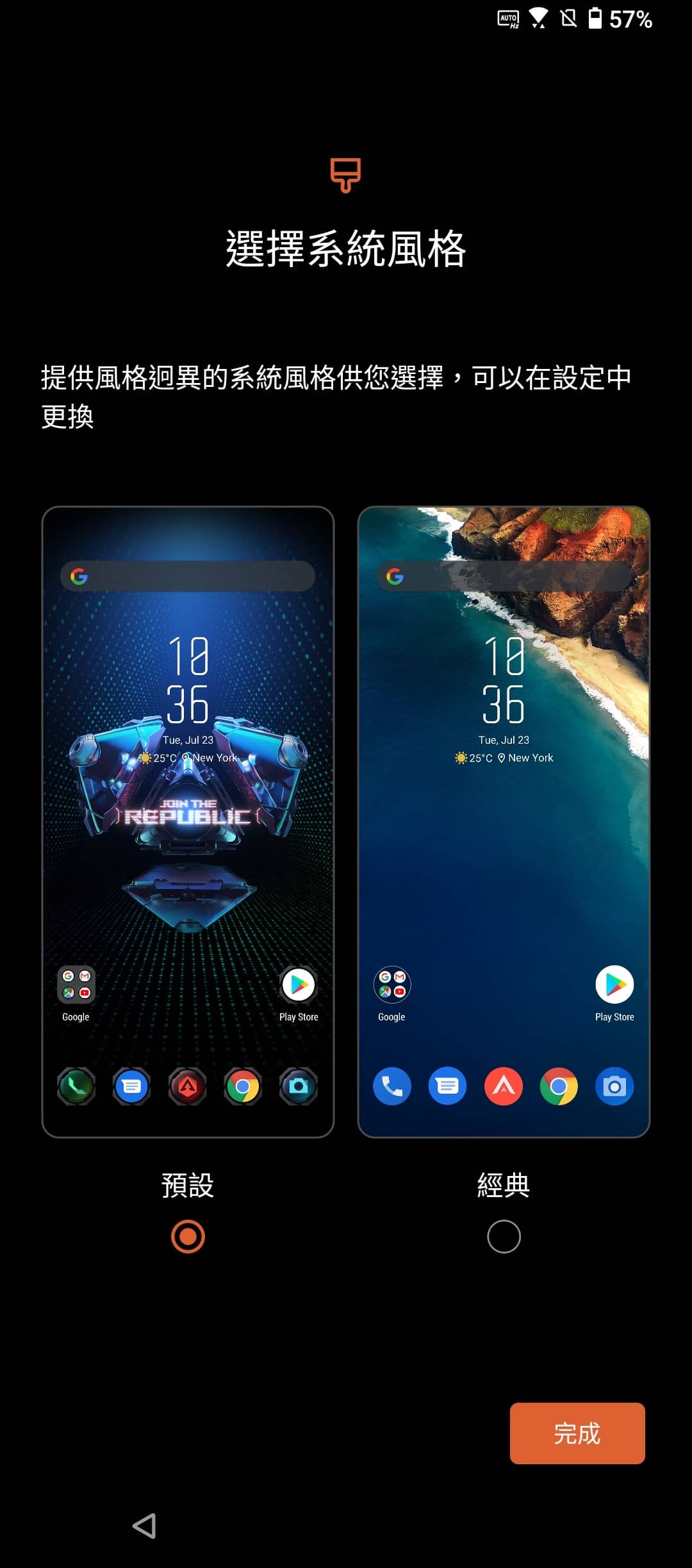 ▲ 初次開機設定手機的時候,系統會讓你選擇要使用「ROG 主題」還是「Google 原生主題」。