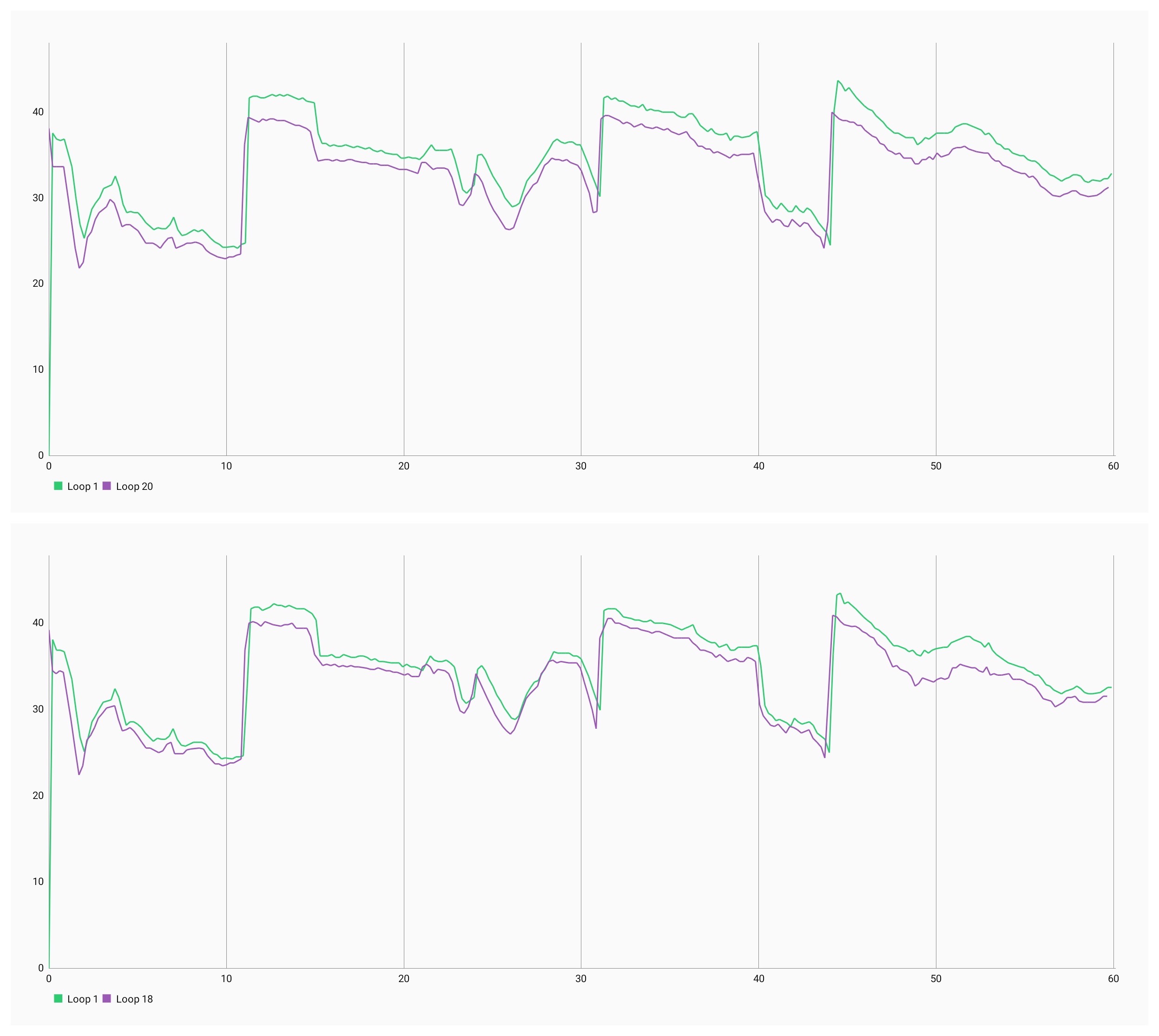 ▲ 這個壓力測試總共有 20 回(Loop),上面這個圖表是在比較「最佳」(幀率越穩定、越高)與「最差」(幀率越不穩定、越低)的兩回的幀率差異,可以看到裝上風扇後的幀率(下圖)更穩定(兩條線更一致)。